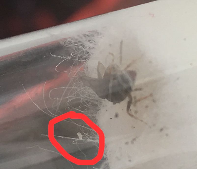 Nach zwei Tagen ruhe schaute ich erneut ins RG und musste zu meinem Enttäuschen feststellen das die Flügel immer noch dran waren. Schlussfolgernd entschloss ich sie heute, mit Reagenzglas, hier auf dem Gartentisch, wieder frei zu lassen. Nach einpaar Stunden wollte ich gucken ob sie noch da war und entdeckte plötzlich eine kleine weiße Kugel. Natürlich habe ich sie danach wieder reingeholt.