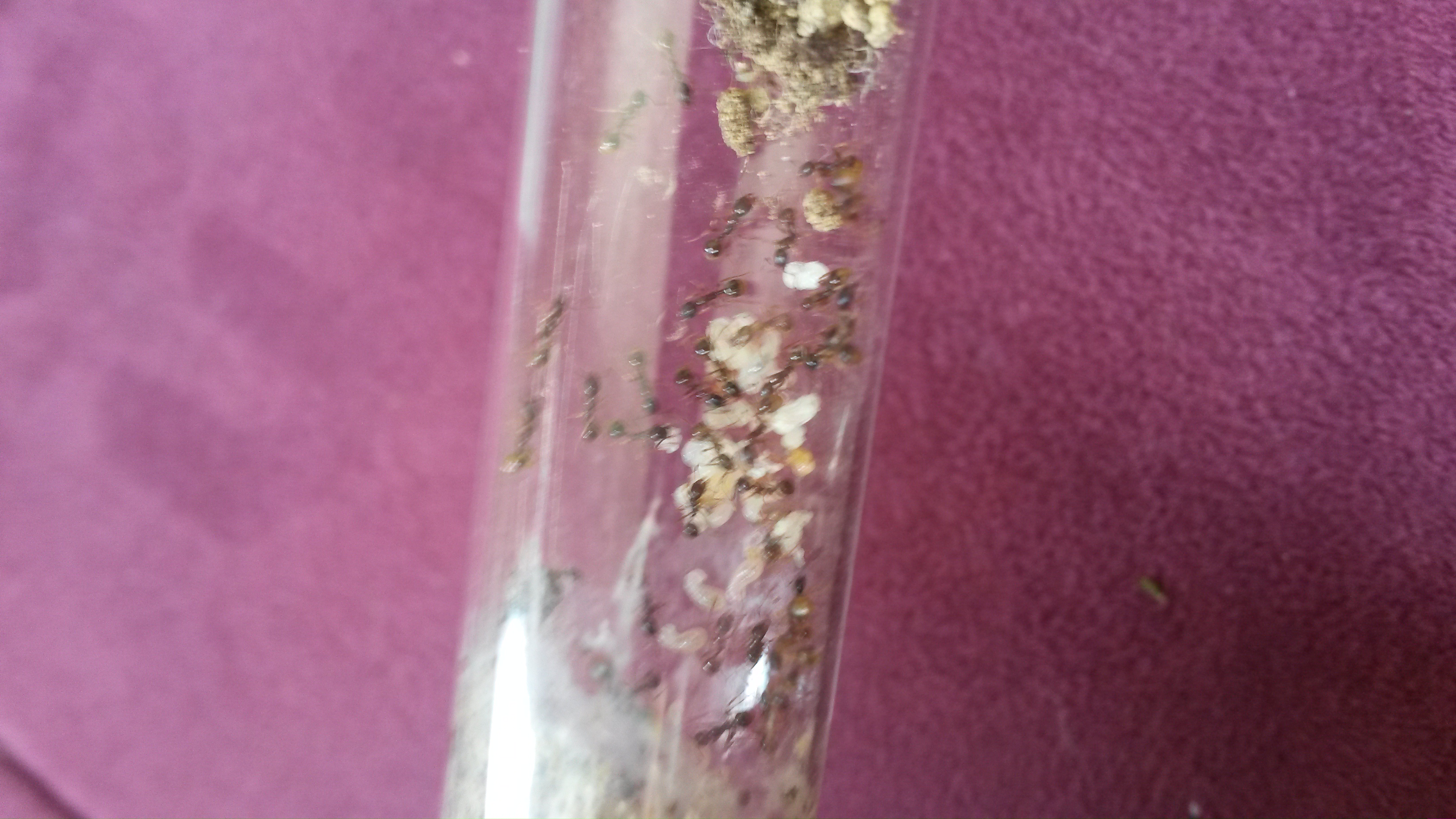 Das sind definitv myrmicine Ameisen (zwei Petiolusglieder, Lasius fällt damit raus), da sie gegründet hat würde ich mal auf Tetramorium tippen (Myrmica ist ja semi-claustral und gründet ohne Futterzugabe garnicht erst).