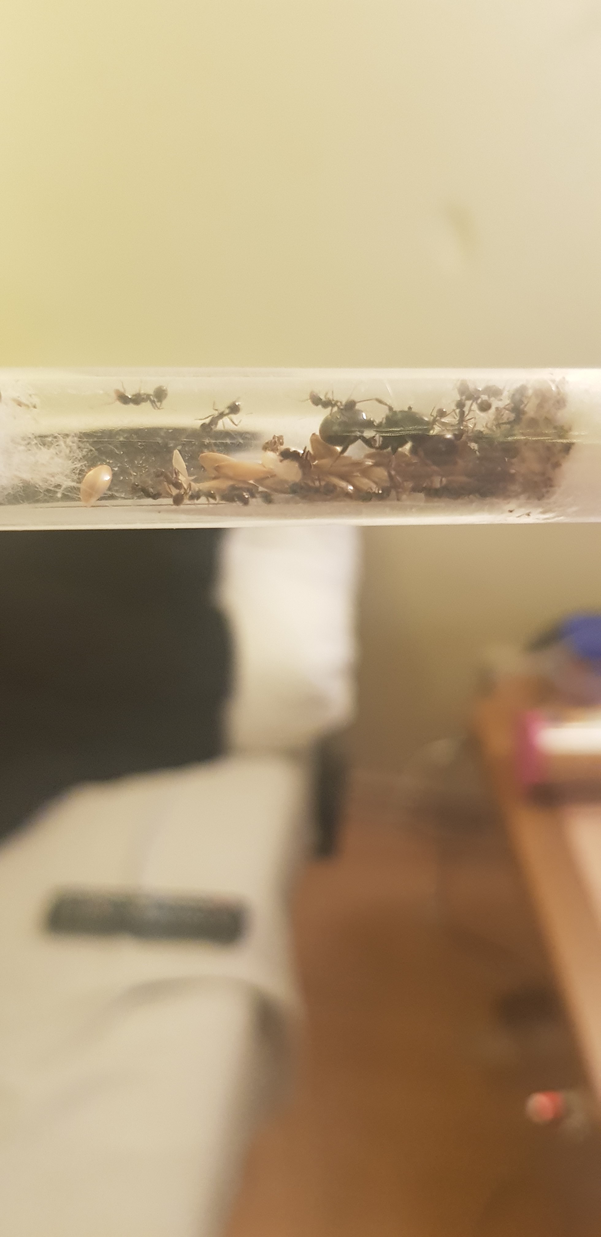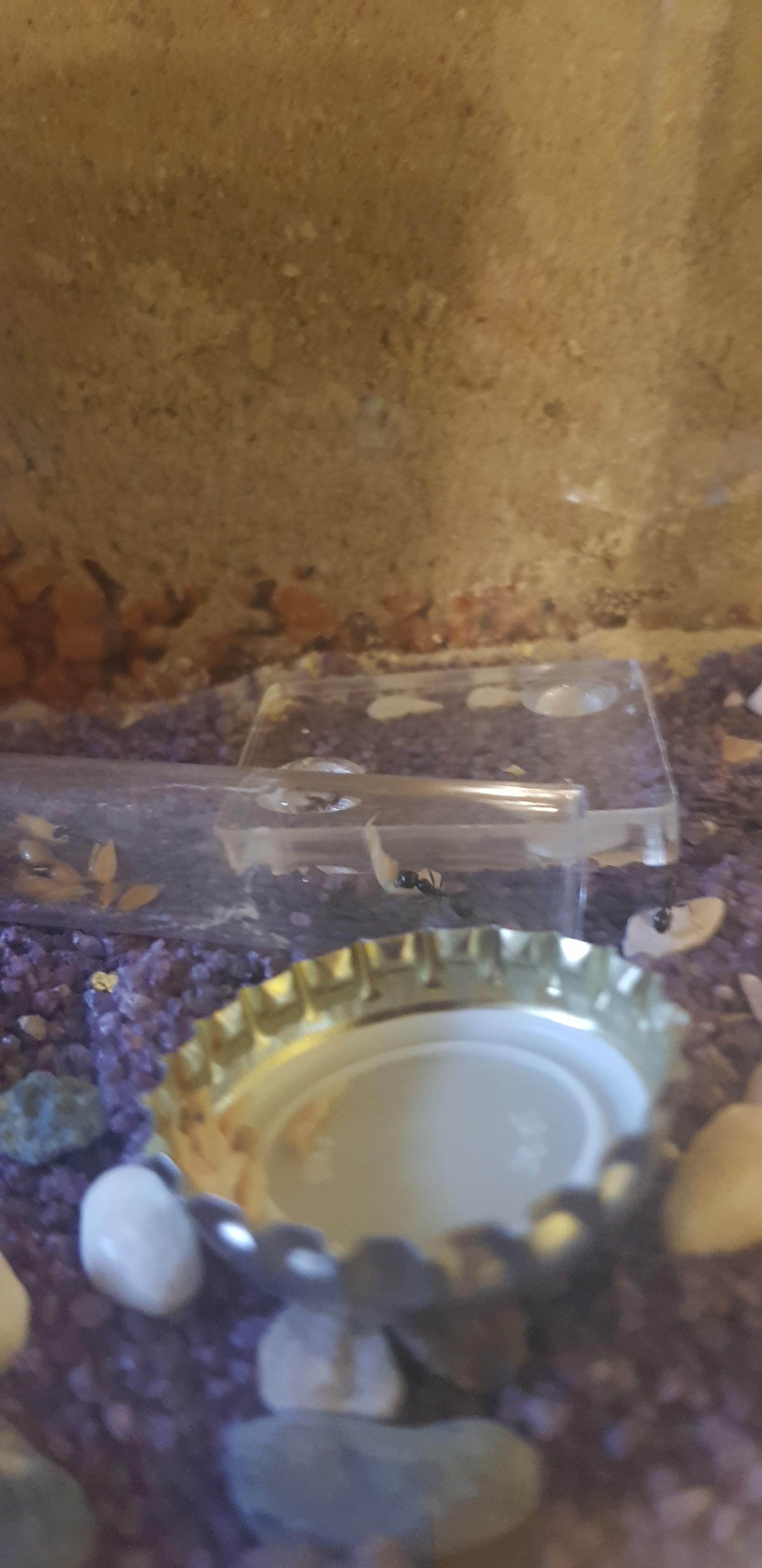 Zur VerfĂŒgung haben sie momentan die Körner im RG (kommen mir zu groß vor, aber bei der Lieferung vom Antstore sind ja kleine SĂ€mereien dabei), Krill im RG, Zuckerwasser im Kronkorken, WassergetrĂ€nkter Wattebausch in nem anderen Kronkorken, Wasser in dieser kleinen TrĂ€nke (wobei ich dem ding irgendwie nicht so wirklich traue), und eine bei den Ameisen mitgelieferte Proteinlösung (stinkt furchtbar, scheint die MĂ€dels nicht zu interessieren, werd ich wohl nicht mehr anbieten).