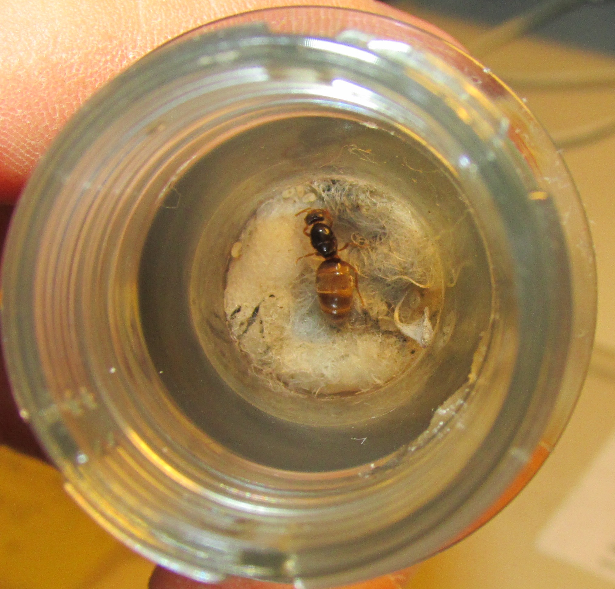 Gegen Ende dieses Sommers fand ich völlig per Zufall eine Ameisenkönigin in meinem Garten. Da ich alles mag, was mehr als 5 Beine hat, packte ich das kleine Wesen in ein Reagenzröhrchen, versorgte es mit Wasser/Watte/Hohlraum und einem Deckel mit Fliegengitter.