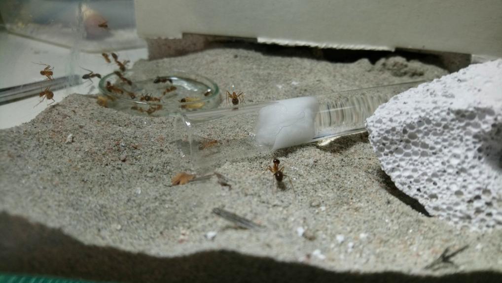 Major so ca. 16mm groß ist. Um einiges größer als eine Camponotus nicobarensis Arbeiterin. Da sie in einem Nest ankamen, musste ich erst gar keins bauen. Also holte ich ein 30x20x20cm Aquarium (12l) aus dem Keller und begann mit der Einrichtung der Arena. Zu aller erst setzte ich das Nest in die Arena. Das Nest hatte einen Schlauchausgang, etwa 30cm lang. Ich wollte diesen gerne behalten und dachte nach wie ich den ihn schön verstecken könnte. Da kam mir eine Idee in den Kopf, die eigentlich auch recht schön aussieht! Ich nehme einfach ein paar Steine und baue sozusagen einen kleinen Berg. Unten könnt ihr dann die Bilder sehen! Ich wollte dann gar nicht lange warten und öffnete gleich den Schlauch. Die Ameisen stürmten regelrecht raus und nach kurzer Zeit waren in der kleinen Arena schon 30-40 Arbeiterinnen. Diese haben sofort die Tropfen Zuckerwasser entdeckt und ehe ich wieder in das Becken gucken konnte, war alles weggeschlürft! Nun kamen auch mehrere Majore angerannt und ich musste schnell wieder das Zuckerwasser nachfüllen.