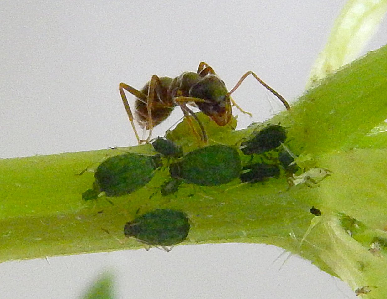 Auf meiner Terrasse 66450 Höchen, direkt am Wald - im Pflanztopf mit Brennessseln sind seit ein paar Wochen einige Ameisen unterwegs... zwischen 5 und 7 mm in etwa, teils sind auch die Blätter zusammen geklebt, allerdings nicht wie im letzten Jahr durch Raupen. Sie kümmern sich um ihre Blattläuse, die meist an den oberen Bereichen sitzen. Könnten es schwarze Wegameisen sein?