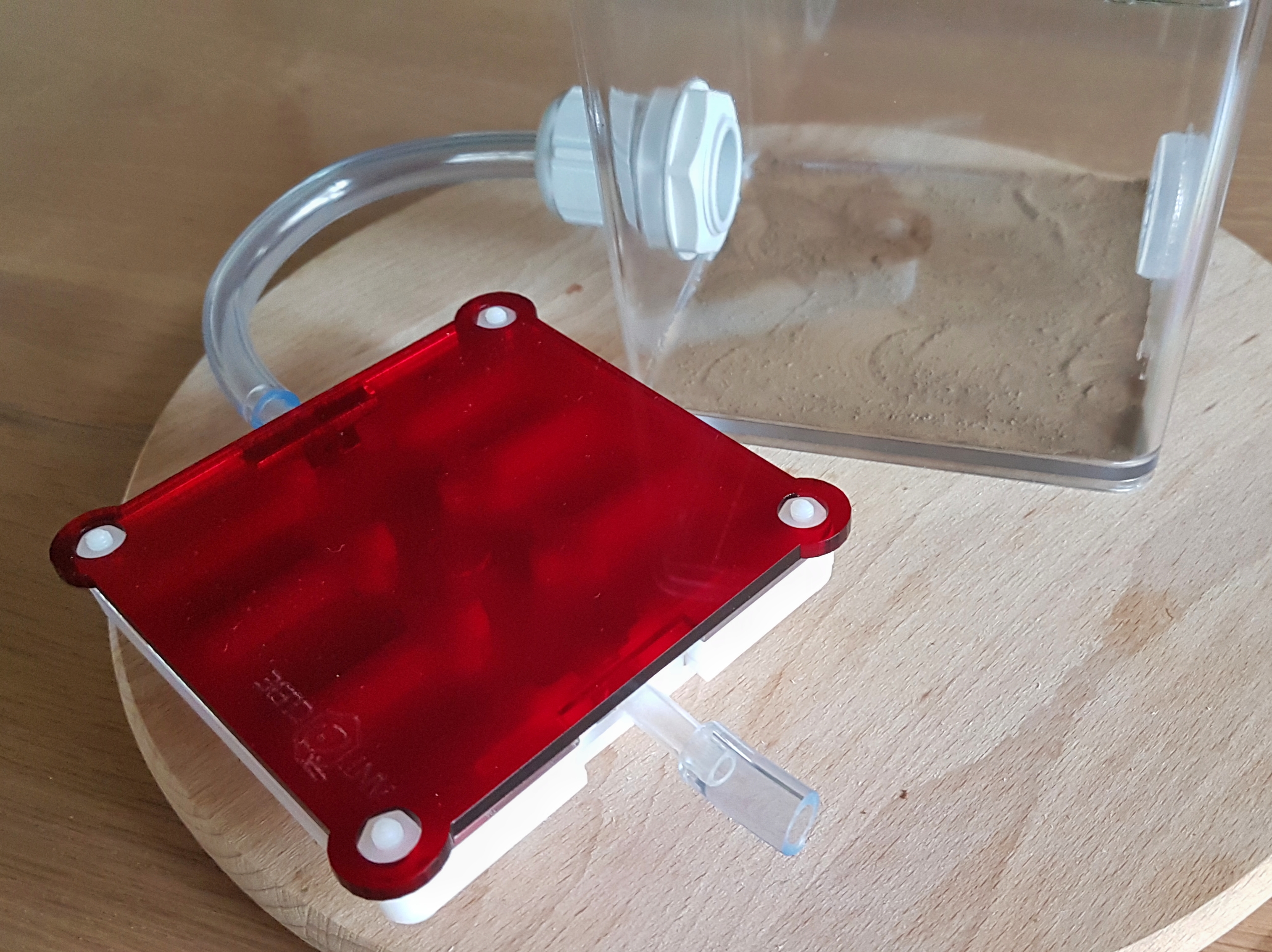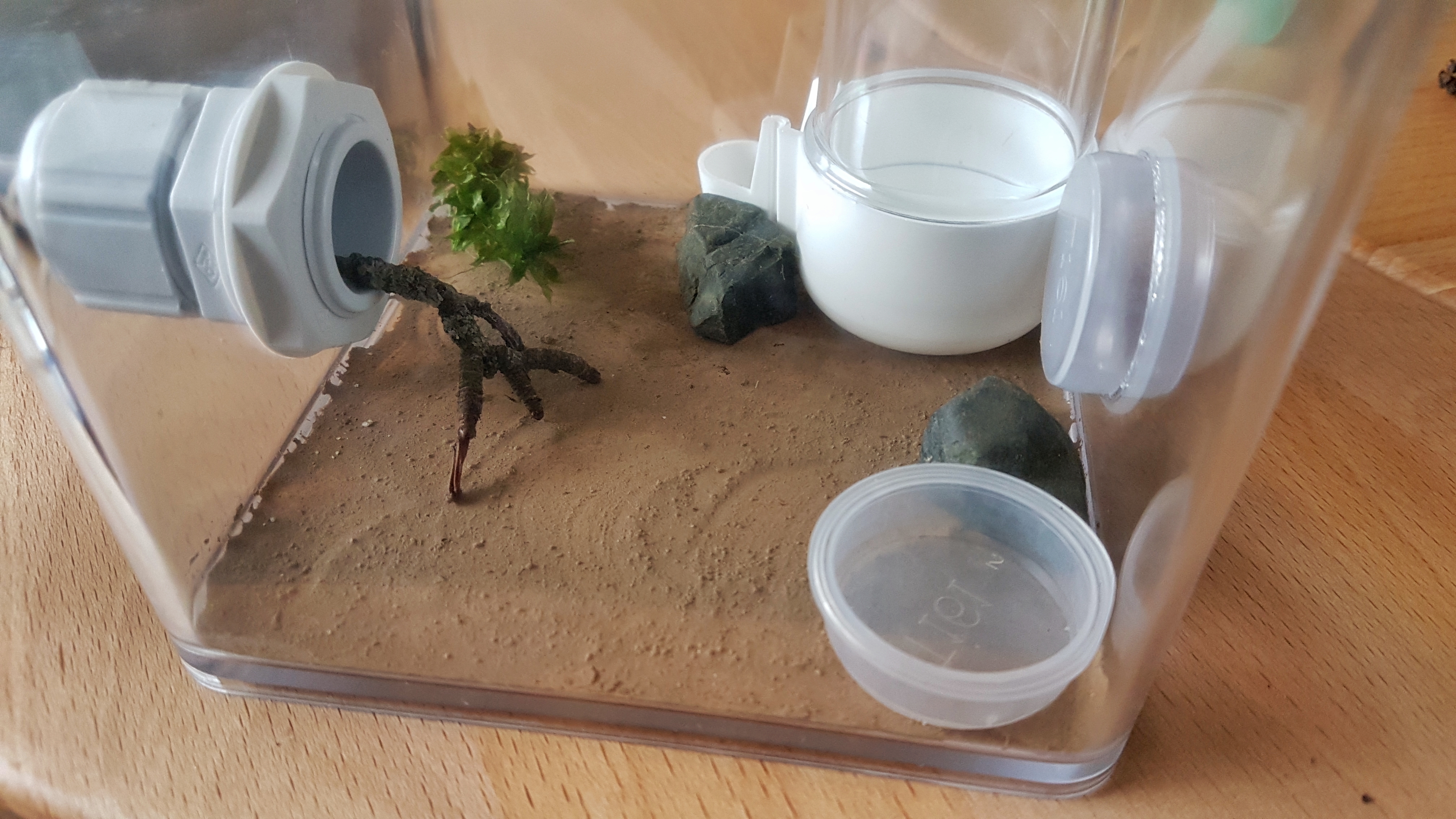 Wenn die Kolonie aus der Winterruhe kommt, würde ich für den Anfang das Reagenzglas in dem sie aktuell leben direkt mit dem Schlauch der Arena verbinden. Das Reagenzglas ist soweit sauber und der Wassertank noch voll.