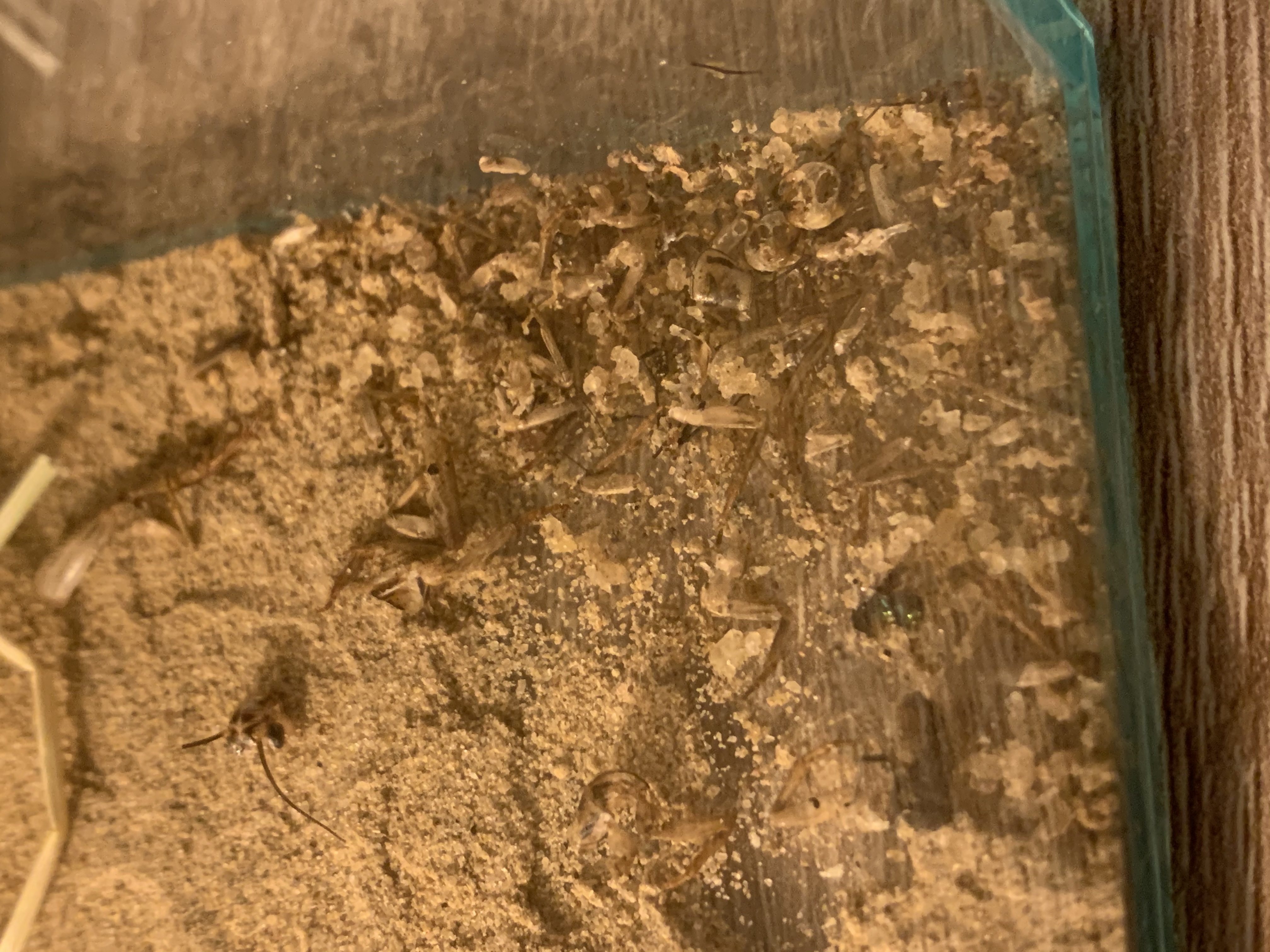 Ich wollte ihnen nicht nur gefrorene Heimchen anbieten, deshalb kaufte ich noch eine weitere Schachtel Heimchen! Die Heimchen tat ich dann in ein selbstgemachtes Formicarium welches ich aus IKEA-Godmorgon Kisten für meine Lasius Niger gebastelt habe! Das Formicarium wurde so in einer Sekunde zum Terrarium umgetauft! Und ... es klappte, die Heimchen leben heute noch darin, jeden Tag nehme ich 2-3 raus, zertrümmere Ihnen mit der Pinzette den Kopf und öffne sie mit einem Skalpell ein wenig! Das mag total brutal klingen, aber es ist wie mit jeder Tiersendung auch! Das Futtertier wird nur dann bedauert, wenn die Sendung sich um das Futtertier selbst dreht!