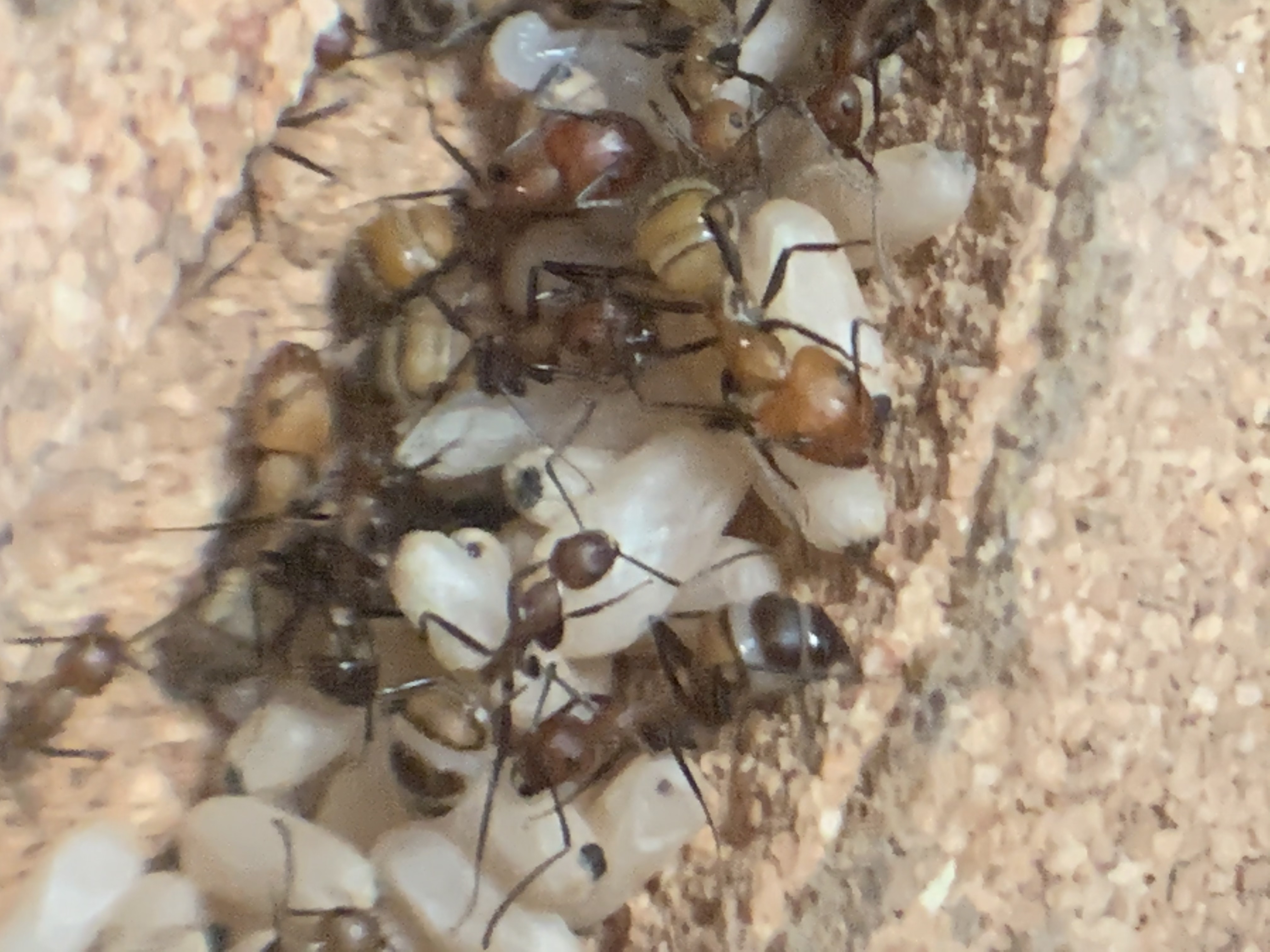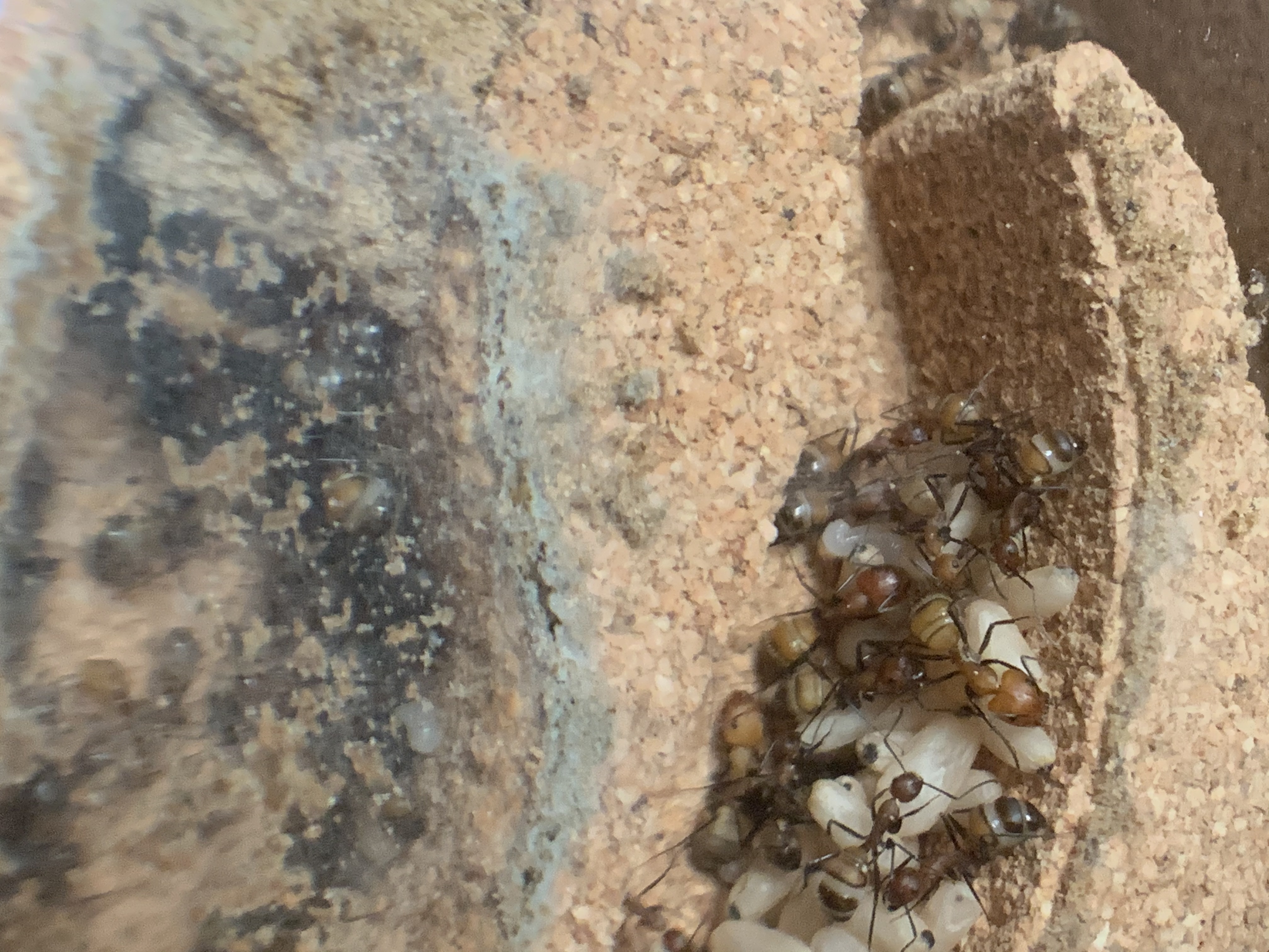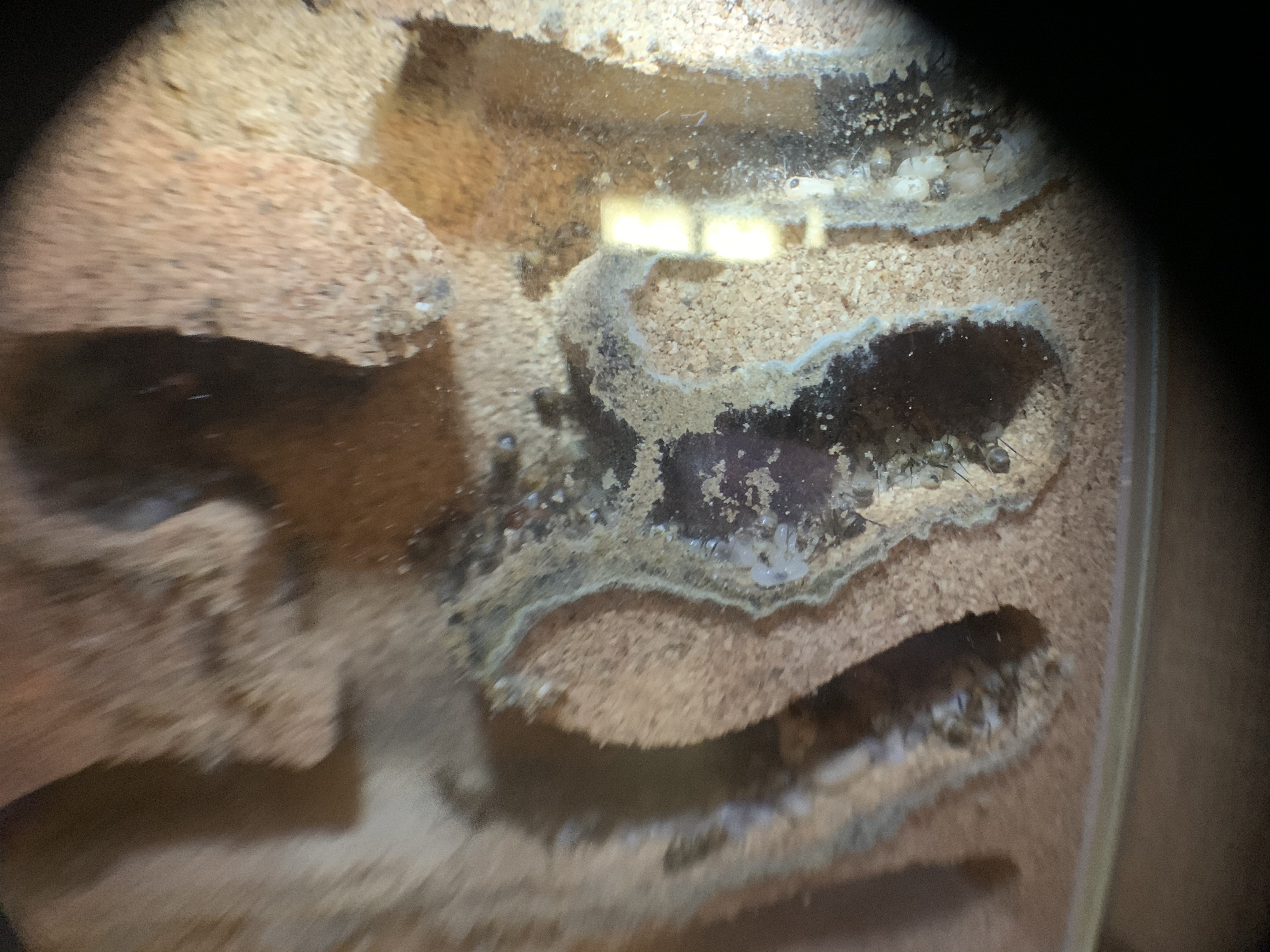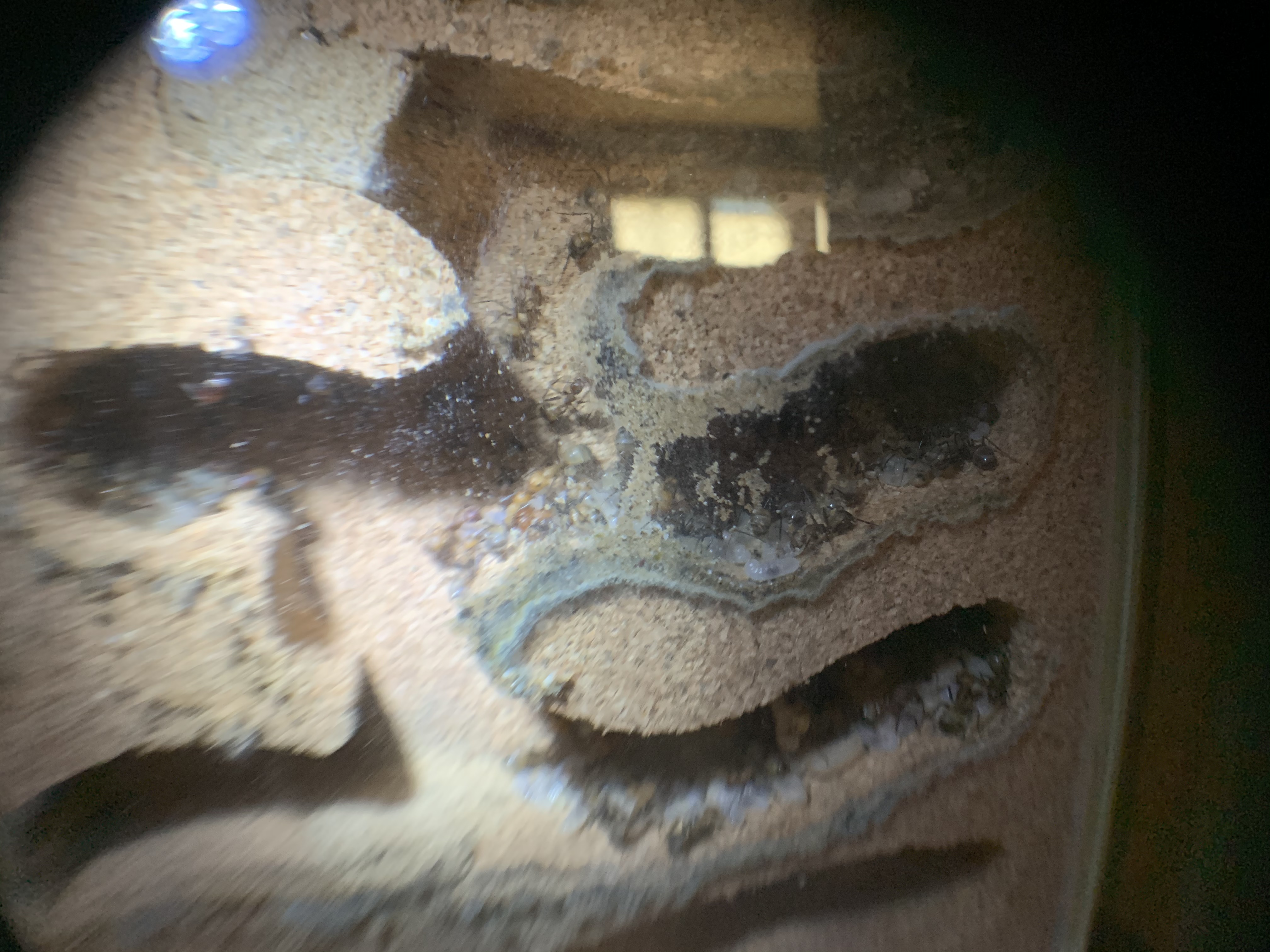 Ich habe vorhin mal das Nest genauer angeschaut, die Ameisen haben zwischen Glas und Korknest den kleinen Zwischenraum mit Material aus der Arena zugestopft!