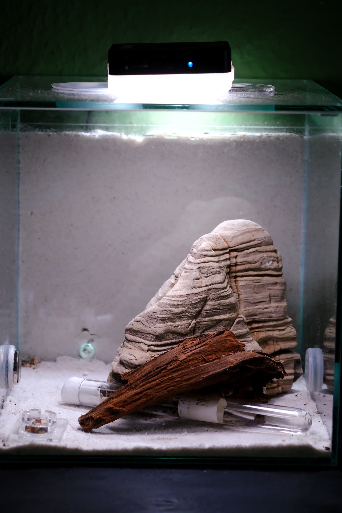 P.S.: Das Fotolicht habe ich nur fĂŒr die Fotos auf die Arena gelegt. Ansonsten leuchtet hier eine kleine Aquarium-LED (AquaLighter) von ~ 8 bis 18 Uhr derzeit, dĂ€chte ich.