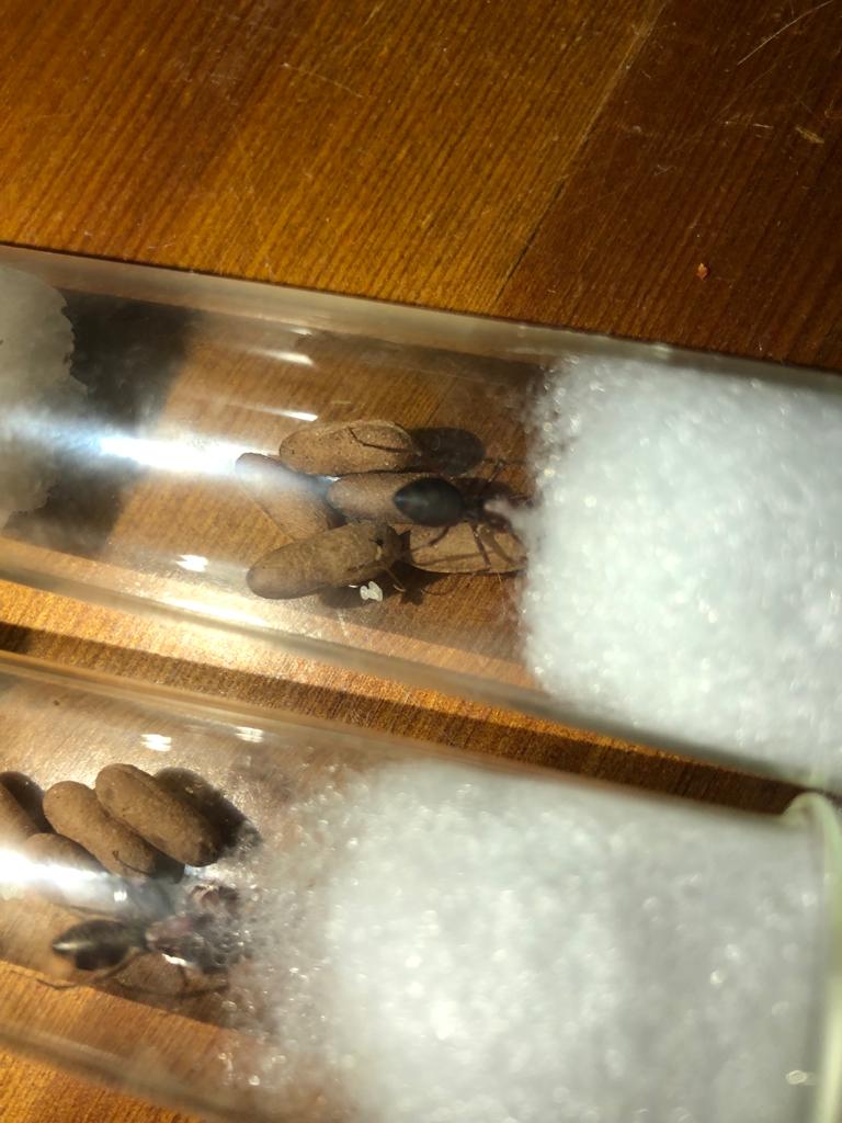 Nachdem @Erne darauf hingewiesen hatte, dass die Gründung bei Cataglyphis spp. mitunter sehr heikel sein kann, haben wir uns entschlossen, die Gynen mit ein paar Puppen aus einem bestehenden Nest zu unterstützen. Wir wollten die Wahrscheinlichkeit für eine erfolgreiche Gründung, so gut wir das beeinflussen konnten, erhöhen. Ich kann gar nicht beschreiben, wie schlecht wir uns dabei gefühlt haben, im Bau der wunderschönen Tiere herumzuwühlen, doch letztendlich fanden wir neun Puppen, von denen wir 4 der einen und fünf der anderen unterjubelten. Die Größe der Puppen verunsichert mich bis jetzt, ich hoffe, dass es sich um Arbeiterinnen handelt und nicht um Geschlechtstiere, doch nachdem Majors sogar größer werden können als Gynen, bleibt wohl nur abzuwarten.
