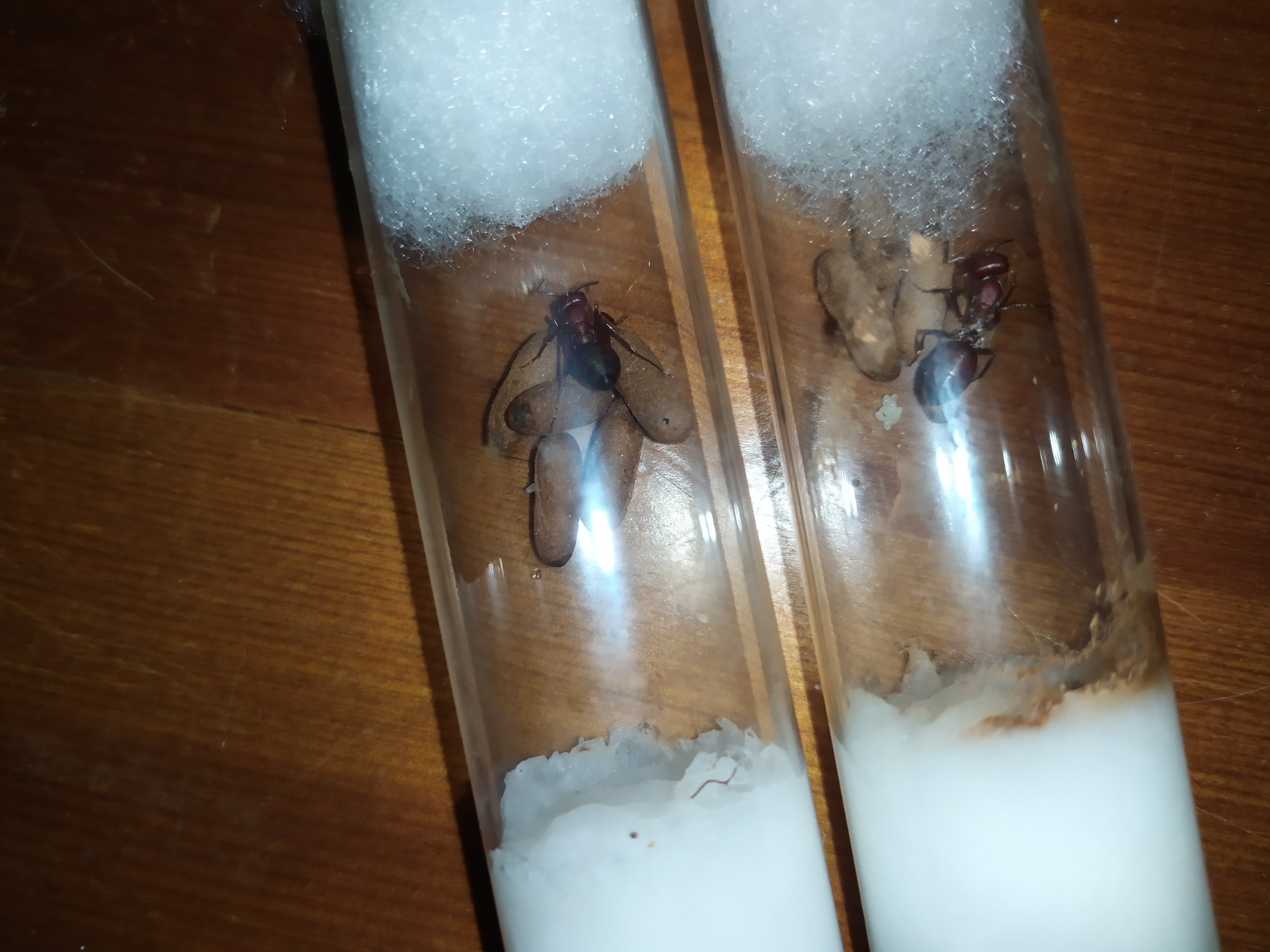 Zu unserer großen Freude entdeckten wir nun auch bei der zweiten Gyne einen größeren Eierhaufen (~10 Eier). Es fiel uns auch auf, dass die erste Gyne an einem Kokon zu beißen begann. Es scheinte auch ein Fühler rauszuschauen. Das ließ uns hoffen, bei unserer Rückkehr evtl. eine erste Arbeiterin zu entdecken.