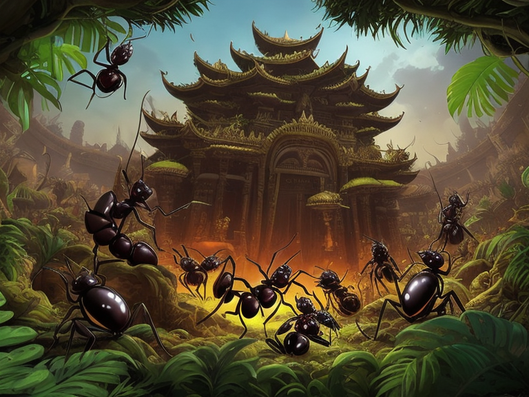 Langsam nĂ€hert er sich einem der Tempel, an dem er einen Eingang sieht. Er bleibt stehen, als er aus dem Tempeleingang ungewöhnliche GerĂ€usche hört. Eine Art schnalz GerĂ€usch und knacken sowie etwas, was sich wie schnelle Schritte anhört. So etwas hatte er noch nie zuvor gehört. Die GerĂ€usche wurden lauter, und er bekommt etwas Angst und geht wieder Richtung der schĂŒtzenden BĂ€ume. Er versteckt sich hinter den groĂen BlĂ€ttern und beobachtet den Tempeleingang.
