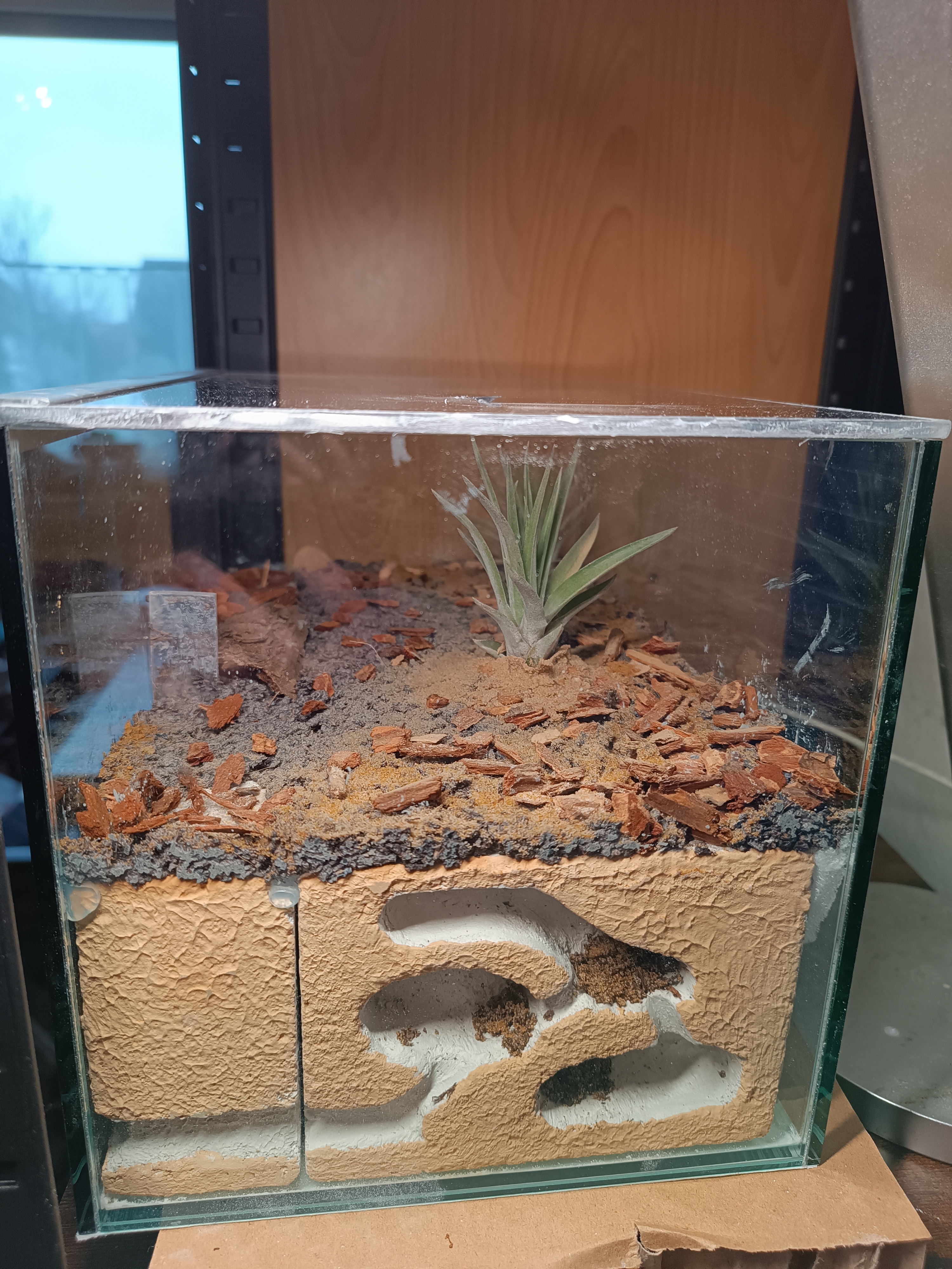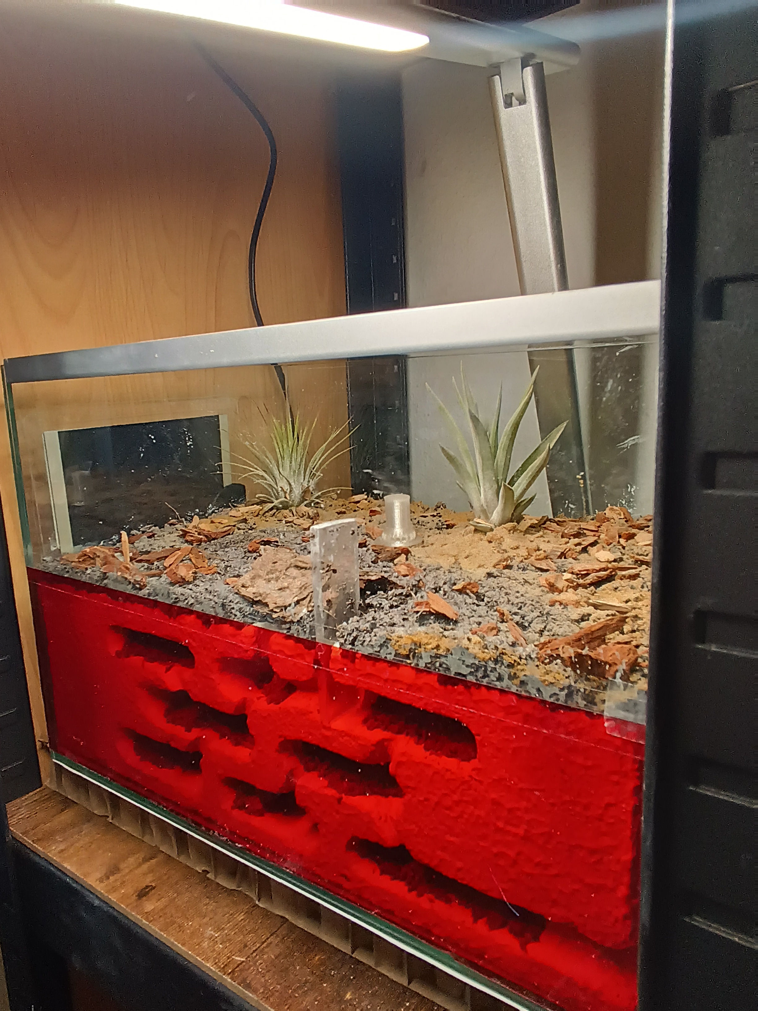 Für das Substrat in der Arena habe ich Regenwald Bodengrund mit etwas Lehm und Sand gemischt und dann eine ca. 0,5 bis 1 cm dicke Schicht verteilt. Dazu habe ich noch 2 Tillandsien in die Arena Gestellt und verschiedenen Sand verstreut um es etwas natürlicher aussehen zu lassen.