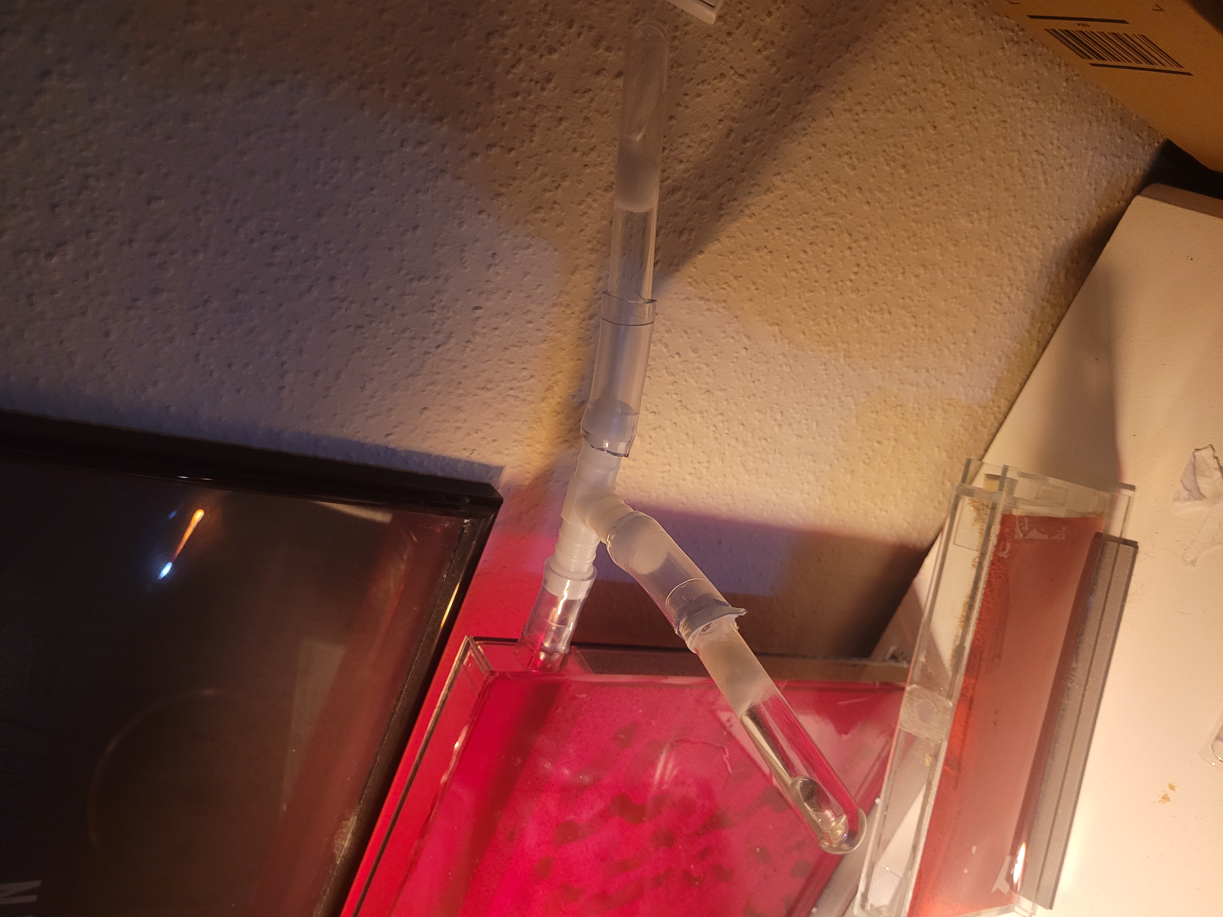 Daraufhin habe ich mich dann entschieden, ihnen ein neues Nest anzubieten, einerseits wegen meiner Befürchtung, dass es zu warm werden könnte, andererseits weil es plötzlich "voll" aussah. Im Forum hatte ich mich dann auch angemeldet und meine Sorgen wurden fachmännisch beschwichtigt. Da war der Warenkorb aber schon gefüllt, bestellt und bezahlt. Nun haben sie ein exorbitant großes neues Standnest samt Korkeinsatz (30x60cm), sowie - dank Pincos Nicos Haltungsbericht - auch eine kleine Reagenzglas Tankstelle, die nun auch ausgebaut wird. Mir fiel nämlich auf, dass sie zwar immer Honig zur Verfügung hatten, aber nie Zuckerwasser. Schnell Haushaltszuckerlösung vorbereitet, Rea-Glas + Watte und angestöpselt... was soll ich sagen, das Glas wird seit dem nicht mehr unbewacht gelassen und bis auf wenige Ausnahmen nuckeln immer 3-6 Ameisen an der Watte.
