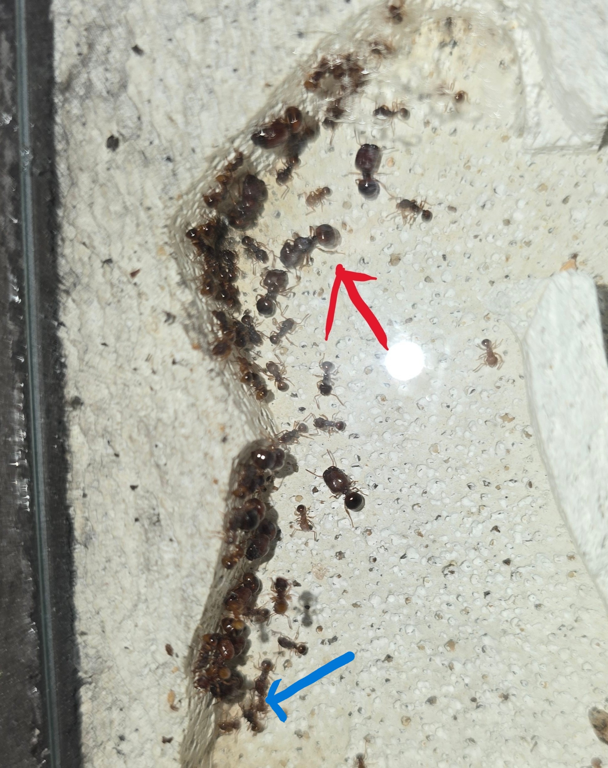 Sie halten sich größtenteils im Nest auf, vereinzelt sieht man Arbeiterin in der Arena.