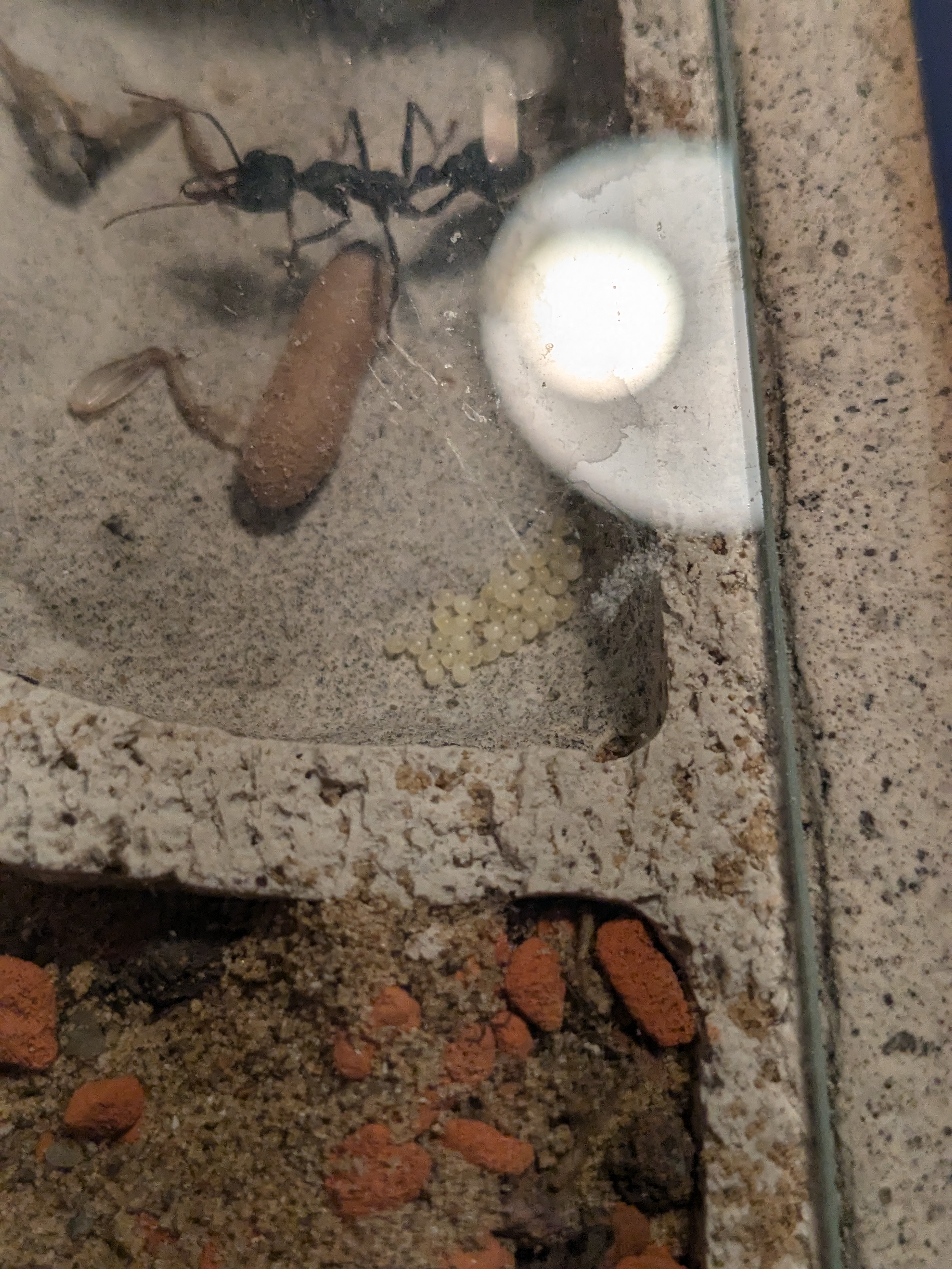 Die pyriformis Kolonie hat vor diesem Push noch erfolgsversprechender ausgesehen, allerdings hatte sie schon immer Problem die Larven erfolgreich zu Verpuppen. Die letzte erfolgreiche Verpuppung liegt mittlerweile ca ein Jahr zurück. Seitdem ist die Kolonie nicht gewachsen - 5 Arbeiterinnen. Eier legt die Königin reichlich, und viele Larven schaffen es bis zur Verpuppung, scheitern aber dort. Das war auch in den ersten beiden Generationen so, aber wenigstens drei Arbeiterinnen haben es damals geschafft.