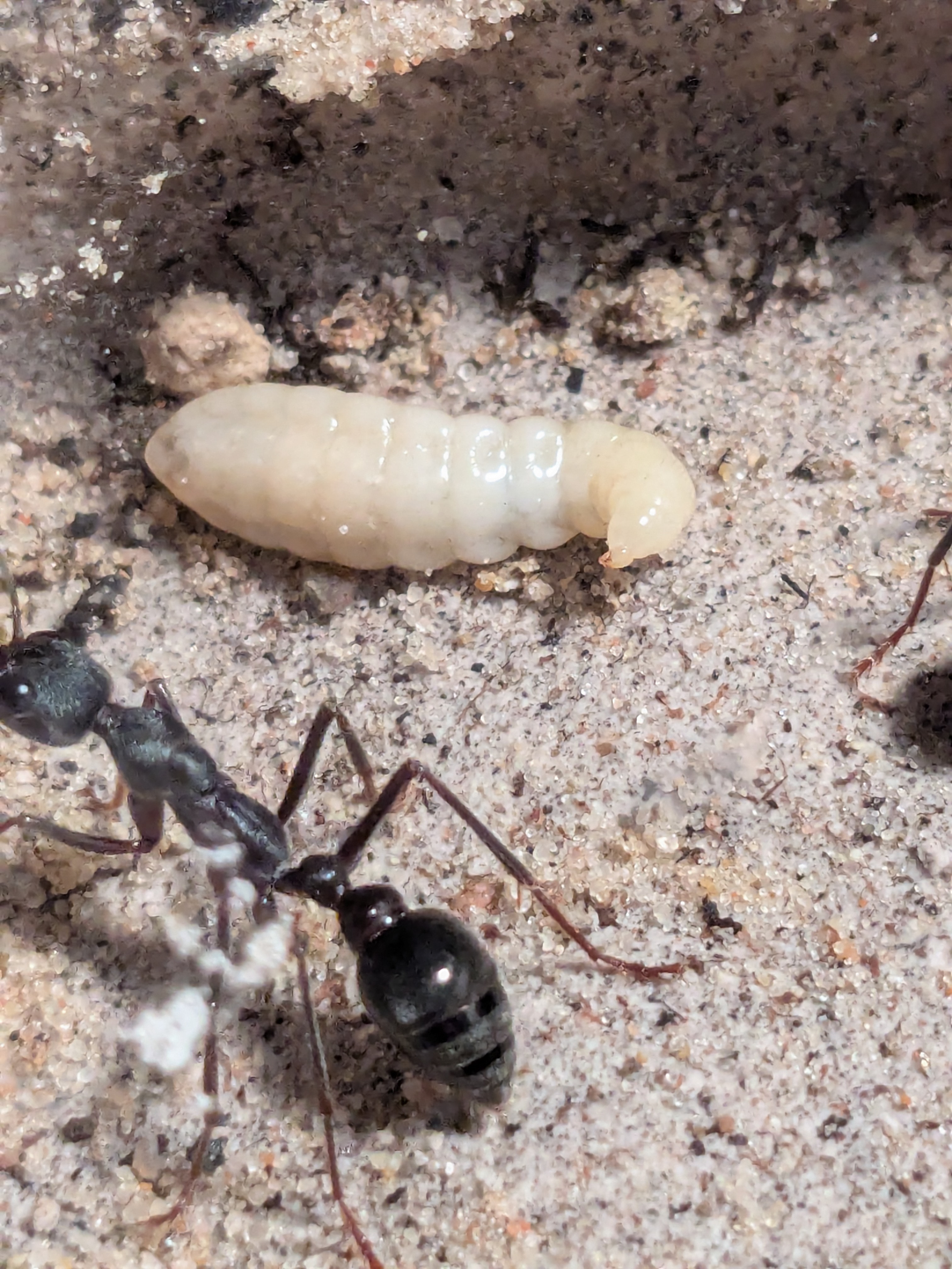 Nachdem die vorletzte Larvengeneration komplett eingegangen ist, habe ich Becken, Nest und Nestsubstrat gewechselt. Es hat nichts gebracht. Auch die aktuelle Generation ist schon fast ganz eingegangen. Zuletzt habe ich das Nest komplett vertrocknen lassen, was die Ameisen nicht mochten, also sind sie in ein bereitstehendes Reagenzglas gezogen. Der Ytong war auch schon ein bisschen schimmlig in einer Abfallkammer. Ins Reagenzglas haben sie die letzten 3 Larven mitgenommen und diese haben sich dort überhaupt nicht mehr weiterentwickelt. Es war auch ein wenig kühler diesen Sommer und theoretisch ist es in Australien ja Winter, evtl waren sie in Winterruhe. Jedenfalls habe ich ihnen jetzt nach ca 3 Wochen im RG nochmal ein neues leicht angefeuchtetes Ytong Nest gegeben und sie haben es sofort angenommen. Eine der drei Larven versucht sich gerade wieder zu verpuppen - sieht nicht gut aus.