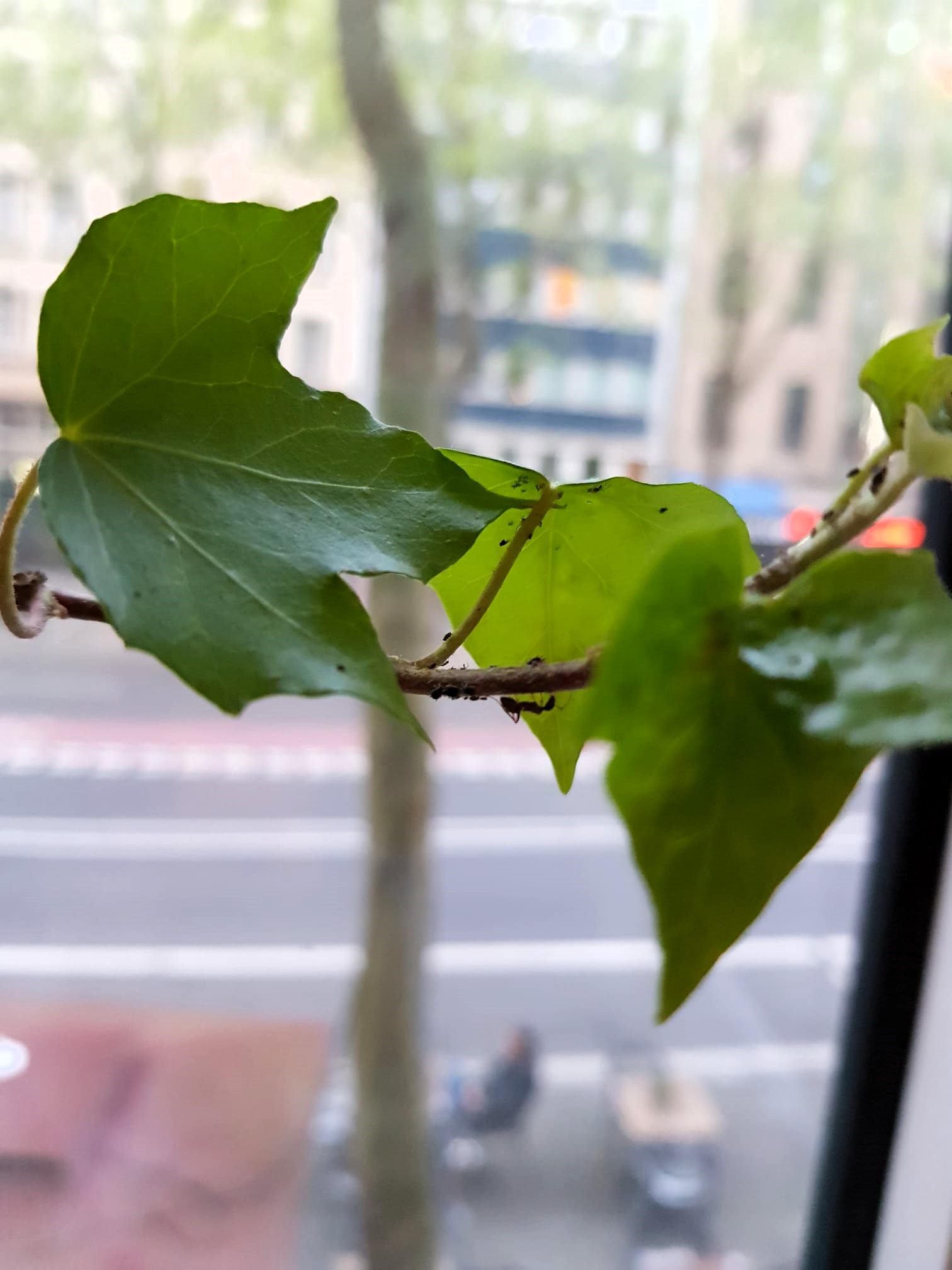 In den letzten Tagen versuchten meine Formica cunicularia ungewohnt hartnäckig, den Wassergraben zu überwinden. Heute entdeckte ich eine kleine Straße Richtung Fensterbank und musste feststellen, dass ein Teil meiner Blattlaus-Planung für dieses Frühjahr sich von selbst erledigt hatte. Die im Winter gesammelten Efeu Ableger, die auf der Fensterbank im Wasser stehen, tragen bereits von selbst eine Menge kleine Blattlaus-Kolonien. Da diese Fenster immer geschlossen sind, wird es sich um den Schlupf von Wintereiern gehandelt haben, die beim Sammeln auf der Pflanze waren.
