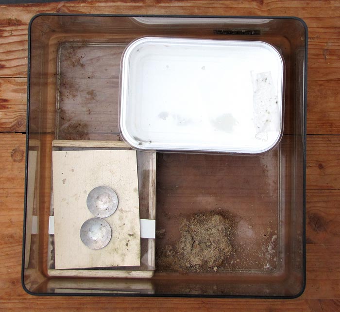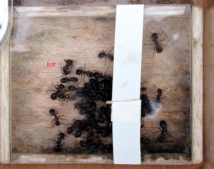 Bild 1 zeigt das „Formikar“: Eine 20 x 20 x 10 cm große Kunststoffschachtel (für Kühlschrank). Der dünne Paraffinölbelag an den Innenrändern hält seit Monaten. In den Deckel ist ein Stück Drahtgaze eingeklebt, ein zweites in die Seitenwand knapp über dem Boden (so kann Kohlendioxid abfließen).