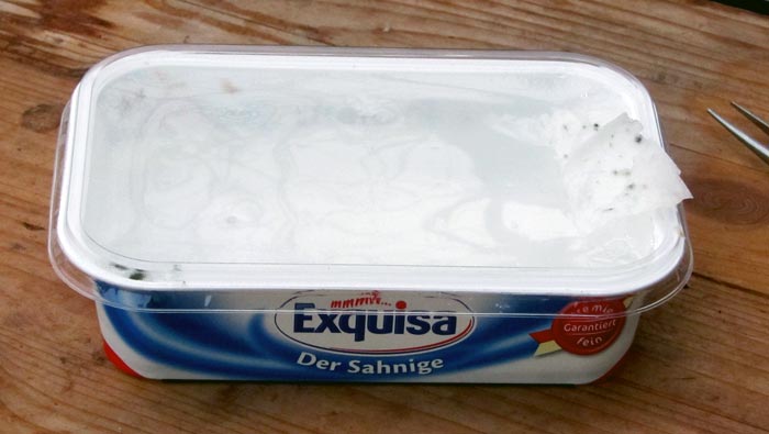 Bild 4: Die „Befeuchtungsmaschine“: Eine Käseschachtel, ca. halb voll Wasser gefüllt. In den Deckel ist rechts ein Schlitz geschnitten, ca. 4 cm lang und 1 mm breit. Durch diesen habe ich einen Streifen Küchenpapier gezogen, der unten ins Wasser hängt. Der Bereich außen, auf dem Deckel, ist ständig nass (die kleinen, grauen Schimmelflecken zeigen, dass ich das Papier demnächst mal austauschen sollte). Die Luftfeuchtigkeit in dem Formikar wird damit zuverlässig hoch genug gehalten, über Monate! (Ich will keine Reklame machen für ein bestimmtes Produkt; jede Plastikverpackung passender Größe ist bestimmt gleich gut geeignet).
