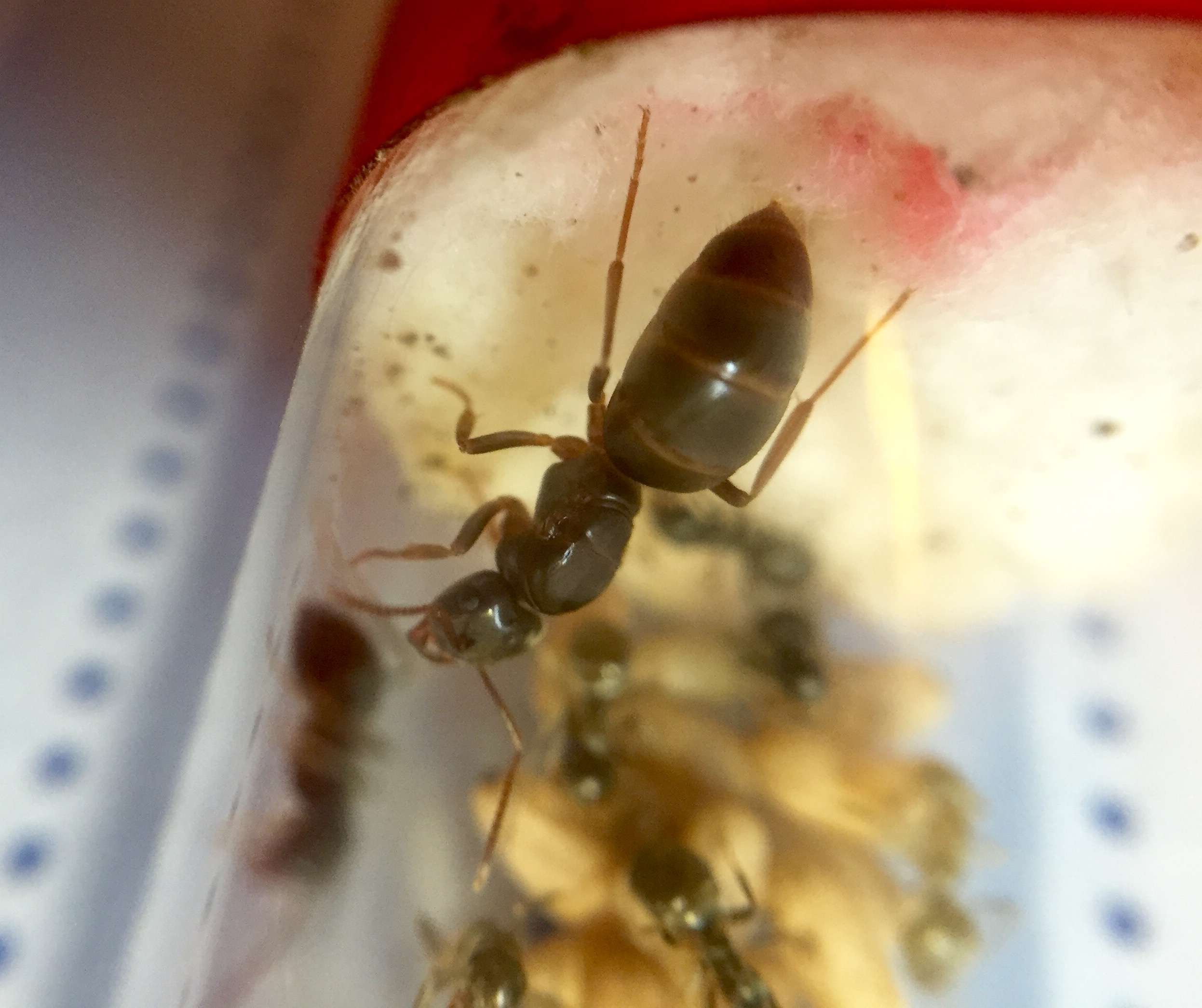 Sie lief direkt in das Nest der Wirtsarbeiterin, und diese verhielten sich erstaunlich friedlich. Eine der Arbeiterinnen verbiss sich zwar in ihrem Bein, doch der Rest zeigte keinerlei Aggression.
