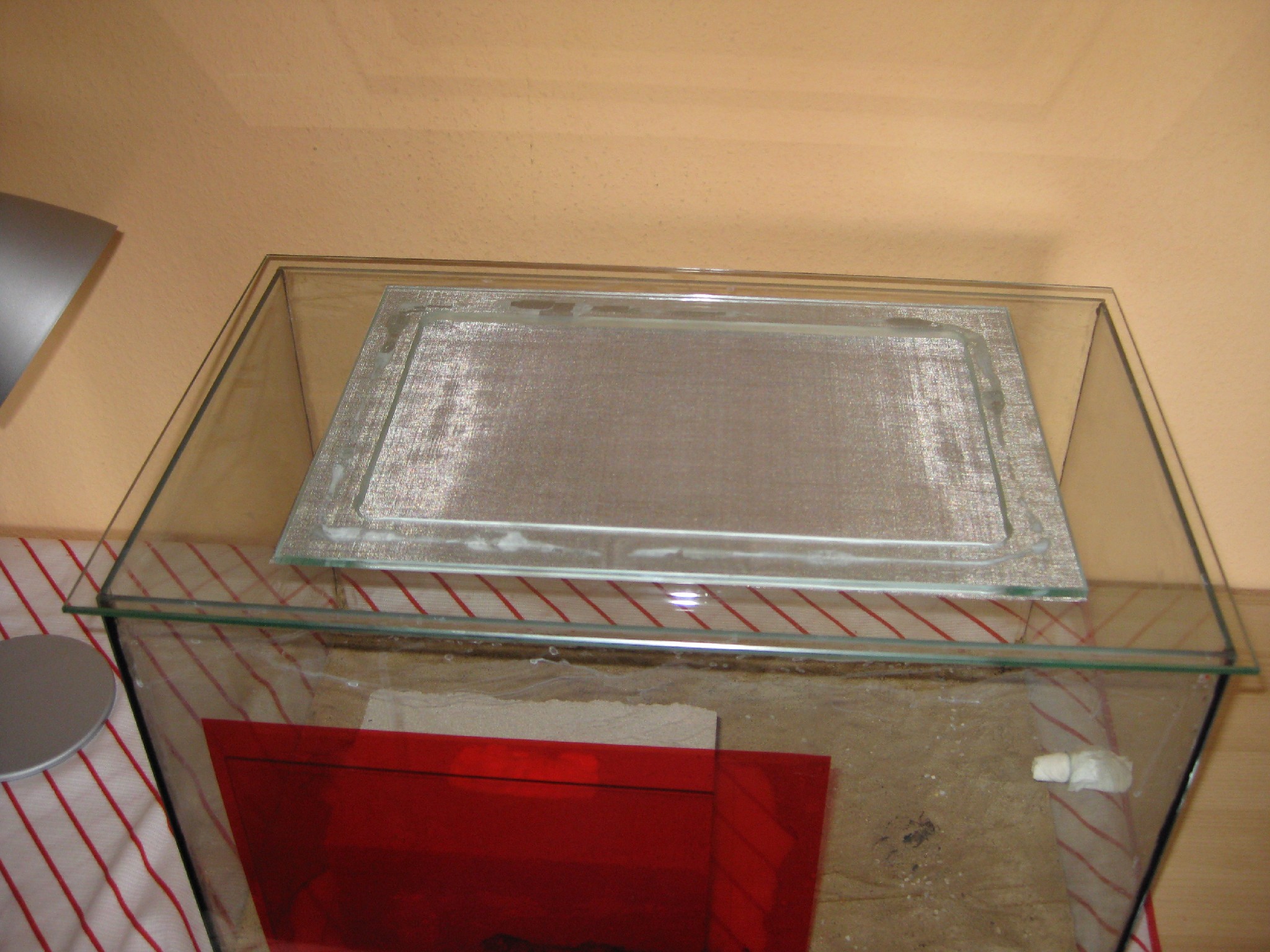 Nun füllte ich Sand-Lehmgemisch hinein so das gerade der Boden bedeckt war (wurde aber leider doch mehr).Und machte ihn mit der Sprühflasche feucht und ließ ihn Trocknen.Leider hebt der Boden nicht wirklich so gut wie in meinem Kunstoffbecken aber ich glaube das lag an der Sand-Lehmmischung.Dan um das PTFE aufzutagen sicherte ich erst einmal den Boden mit Küchenfolie das echt Prima funktioniert und den Herunterfallenden Sand aufhält und somit keine Sandkörner im PTFE hängen oder sogar die Schicht zerstören!Danach als alles trocken aus sah entfernte ich die Folie und richtete das Ytongnest ein.Dabei klebte ich mit Silikon extra eine Scheibe vor die Kamern damit ich falls irgend was kommen sollte den Stein gezwungener massen herausnehmen kann ohne das das Volk dabei schaden nimmt und es auch unkompliziert abläuft.(ich hoffe dazu muss es nicht kommen^^) Am Anfang platzierte ich eine scheibe auf den Sand.auf die Scheibe kam dann der Ytong damit der Sand nicht feucht wird.