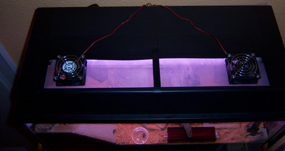 Der eine LĂŒfter zieht die Luft raus der andere blĂ€st sie hinein. Somit zirkuliert die Luft im ganzen Formicarium.