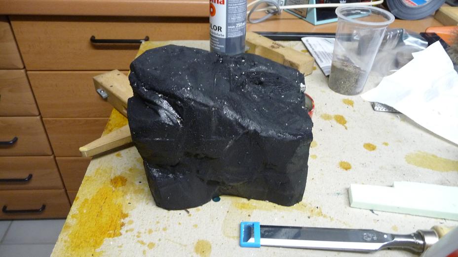 Wieder die ĂŒbliche Vorgehensweise. Styrodur mit Teppichmesser bearbeitet, schwarz grundiert, grau trockengebĂŒrstet. Ich denke aber, wenigstens einmal sollte ich noch darĂŒber gehen. Auf dem Bild glĂ€nzt alles noch sehr frisch. Abwarten.