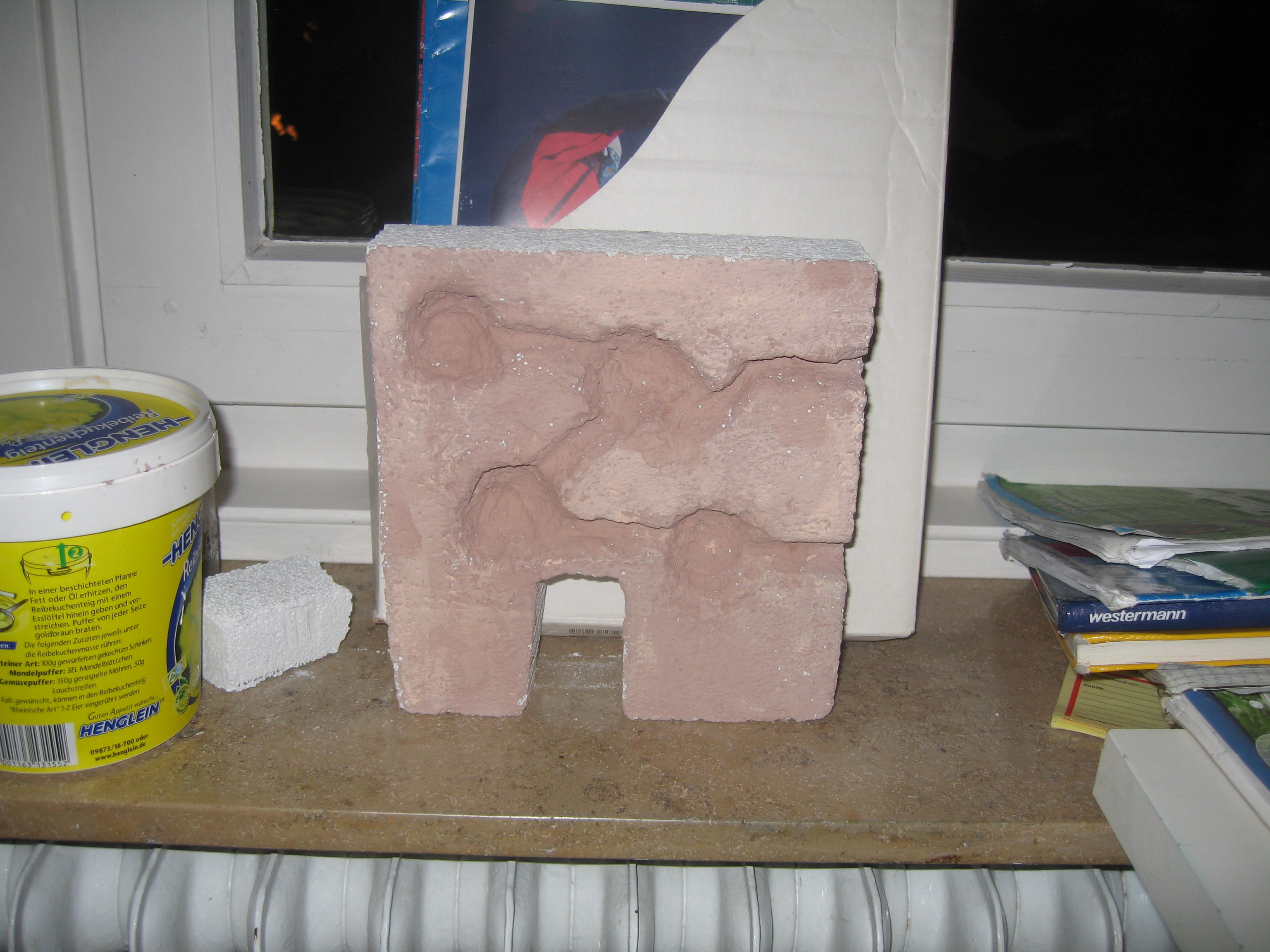 ich habe heute Abend nochmal ein bischen dran rumgeschnitzt und habe jetzt alle Kammern und Gänge fertig. Ich habe den Tipp bekommen den Ytong zu kürzen so dass er jetzt nurnoch 20*20 ist. Morgen kommt eine Lehm-Gips Mischung drauf und vieleicht auch schon das Glas.