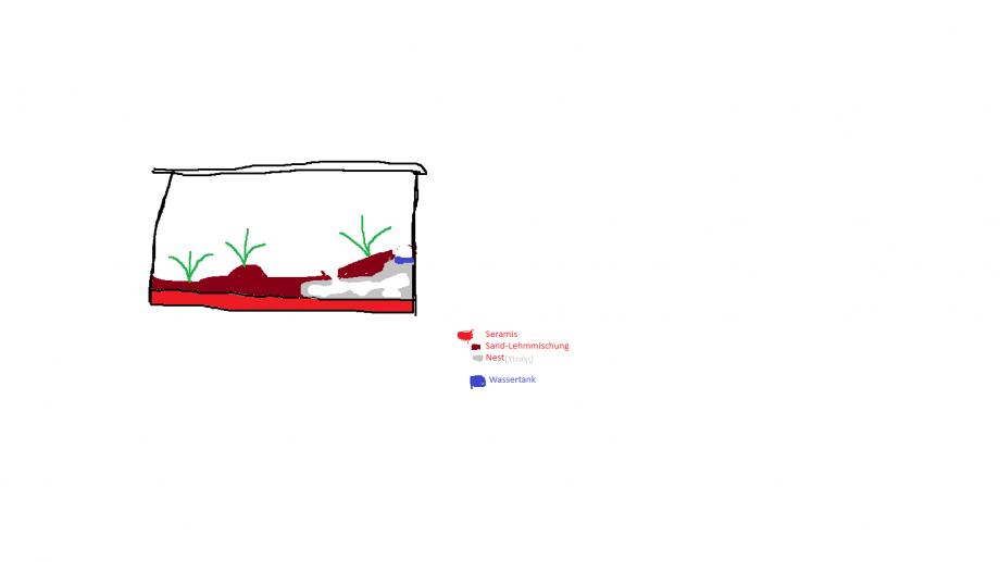 da mein erster Versuch, ein Nest zu bauen, ein bisschen gescheitert ist ;) wollte ich fragen, ob das so möglich ist, wie ich es auf meinem Bild gezeichnet habe. Ich möchte gerne einen Ytong mit den Maßen 20x10 und in ihn dann in einer Ecke des Formicariums an die Scheibe stellen.Wassertank habe ich dann auf das Nest oben gesetzt. Jetzt wollte ich Fragen, ob unter mein Ytongnest noch Seramis muss, damit sich kein Wasser an dem Glassboden absetzt. Außerdem möchte ich gerne eine Sand/Lehmmischung ungefĂ€hr 1cm (oder weniger) ĂŒber dem Nest auftragen, damir es schöner ausschaut. Da ich den Ytong ja regelmĂ€ĂŸig befeuchten muss, ist die Sand/Lehmmischung ja stĂ€ndig grabfĂ€hig und ich muss befĂŒrchten, dass die Ameisen (Lasius niger) sich vielleicht dort eingraben und nicht mein Ytongnest nehmen. Wie kann ich so etwas verhindern?