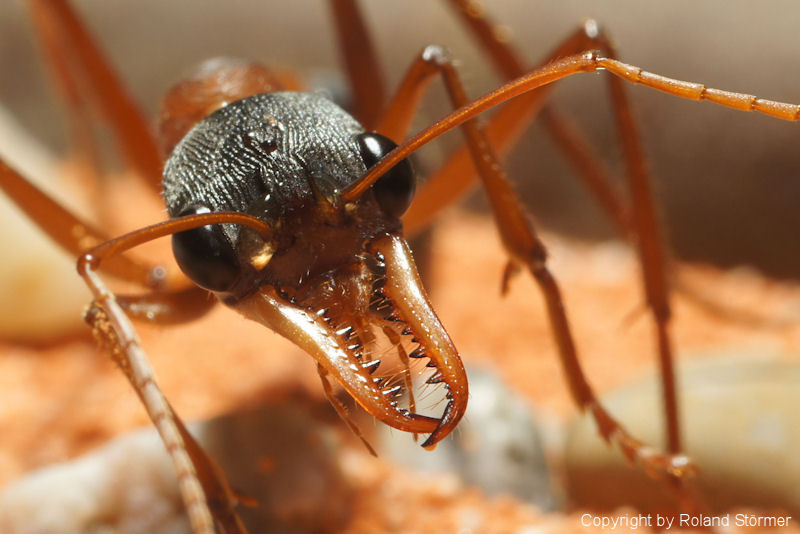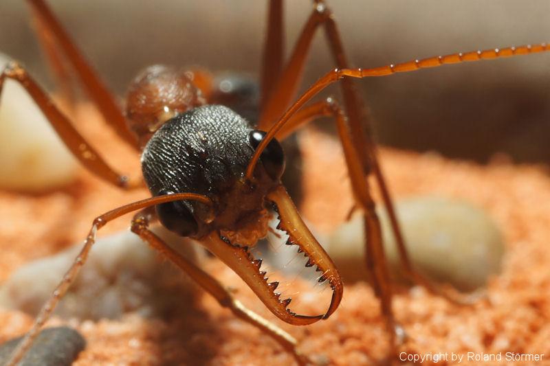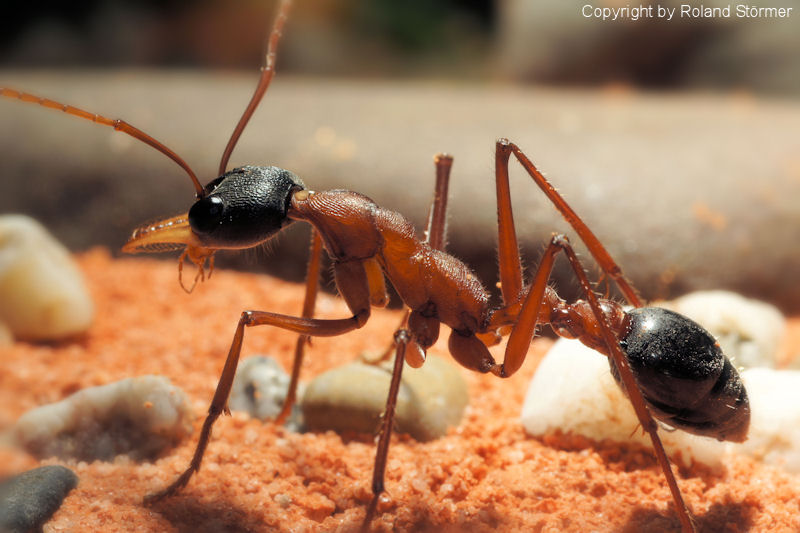 Diese auffällig gefärbte Myrmecia Art ist mit 35-40mm (Königin) bzw. 30mm (Arbeiterin) etwas größer als die Myrmecia pavida.