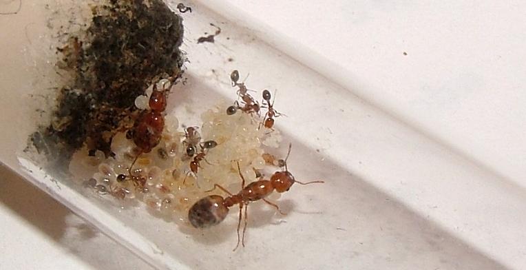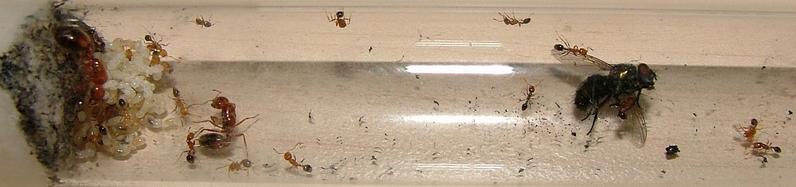 Als sie die anderen erreichte, dauerte es nur höchstens zwei Sekunden, bis sich dort alles in ein heilloses Durcheinander entwickelte. Ich konnte beobachten, wie die Arbeiterin die erste der anderen aufs hefigste betrillerte, weiter rannte und es weitergab, so wie die, welche die Botschaft empfangen hatte. Eine (!) Straße (!) bildete sich im RG. Frisch geschlüpfte Pygmäen blieben zurück, der Rest rannte zur Fliege, die noch immer von der einen einzigen, "mutigen" Jungarbeiterin beschäftigt wurde und keine Ruhe mehr hatte. Dann fielen die anderen über sie her. Da die Fliege ihnen kraftmäßig aber weit überlegen war, kamen sie nicht richtig dazu Angriffsfläche zu ergattern. Die