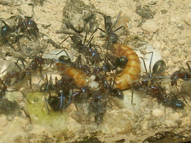 Die Iridomyrmex purpureus sind nicht wĂ€hlerisch, MehlwĂŒrmer werden gerne genommen.