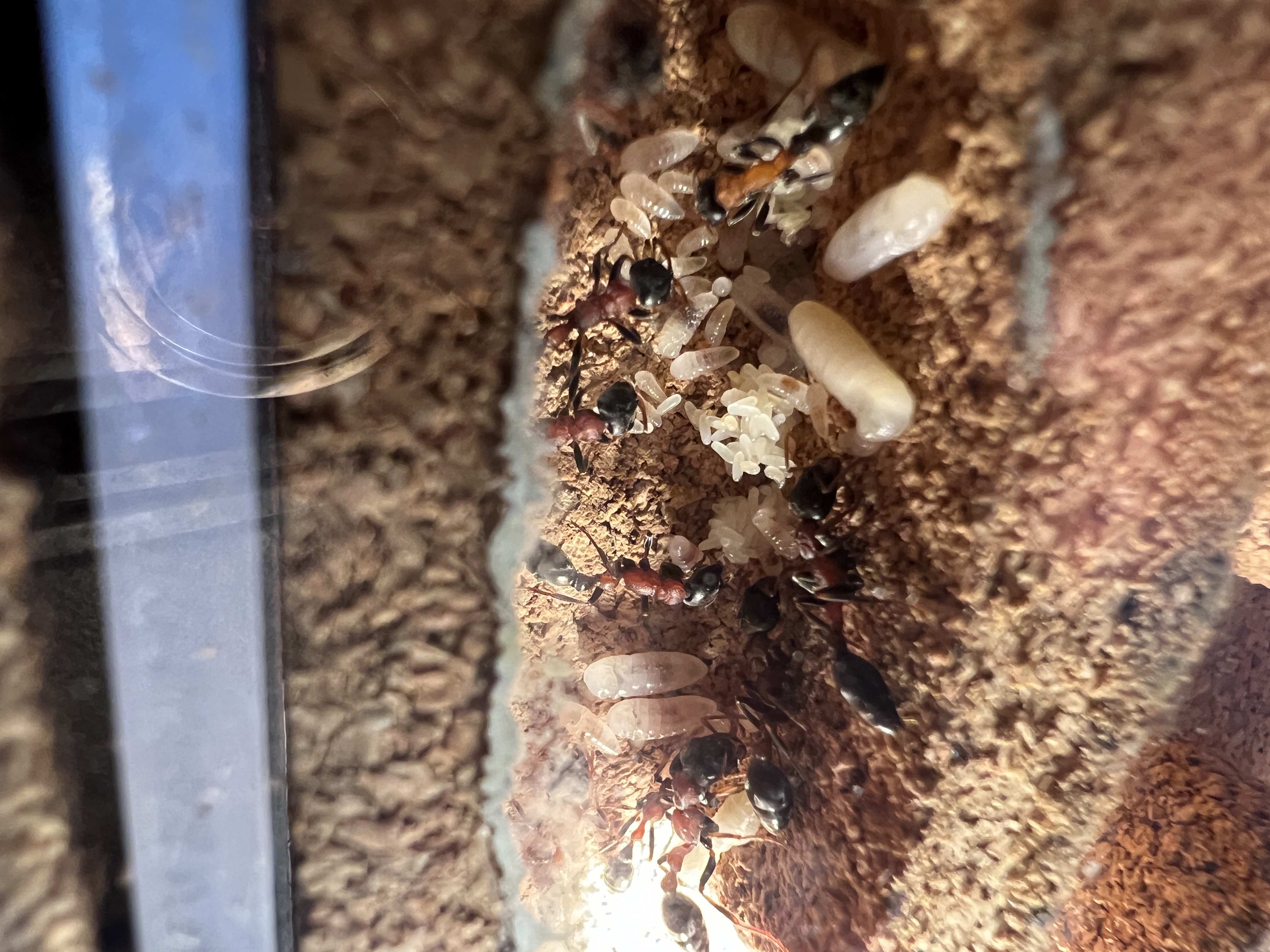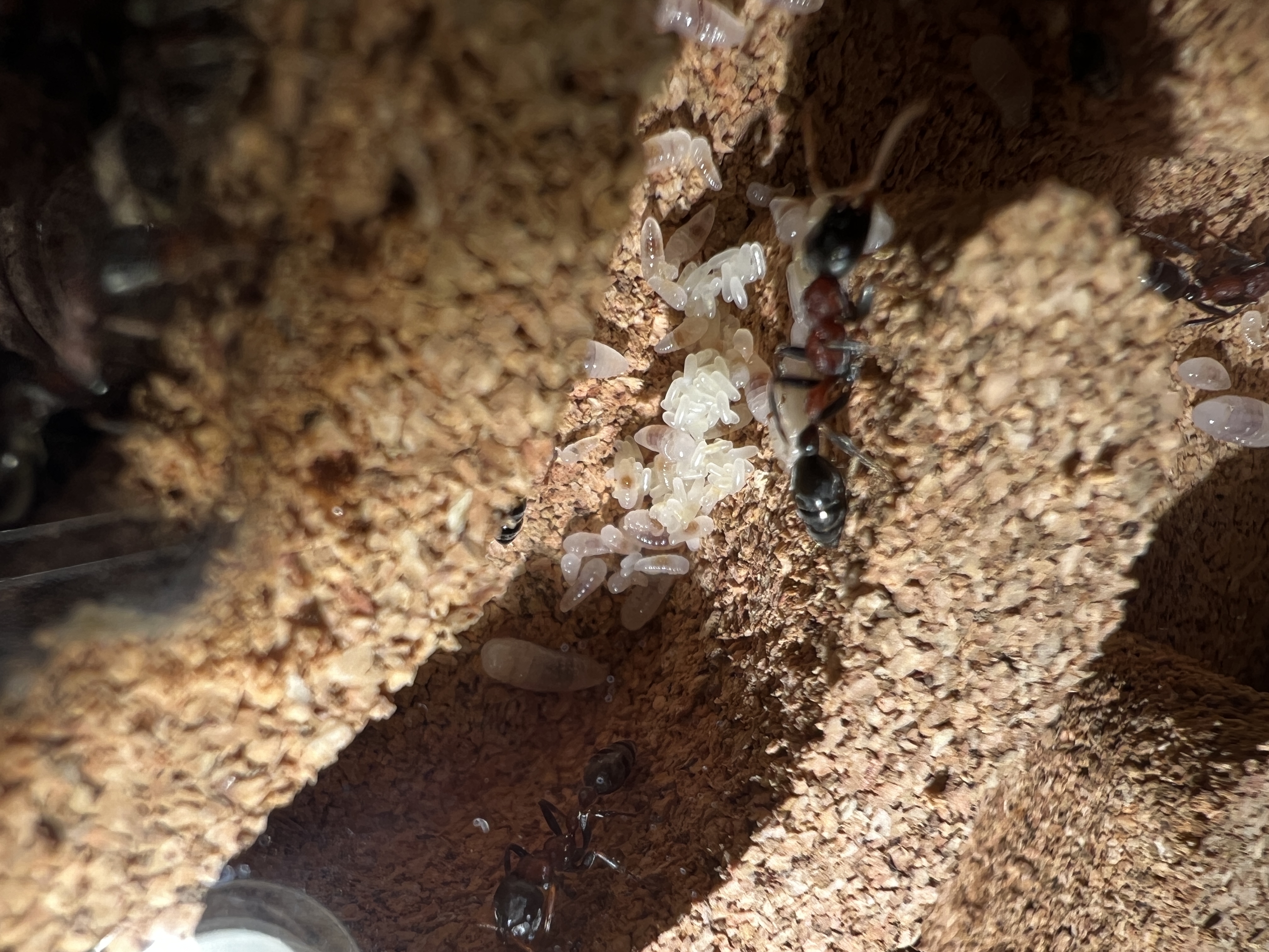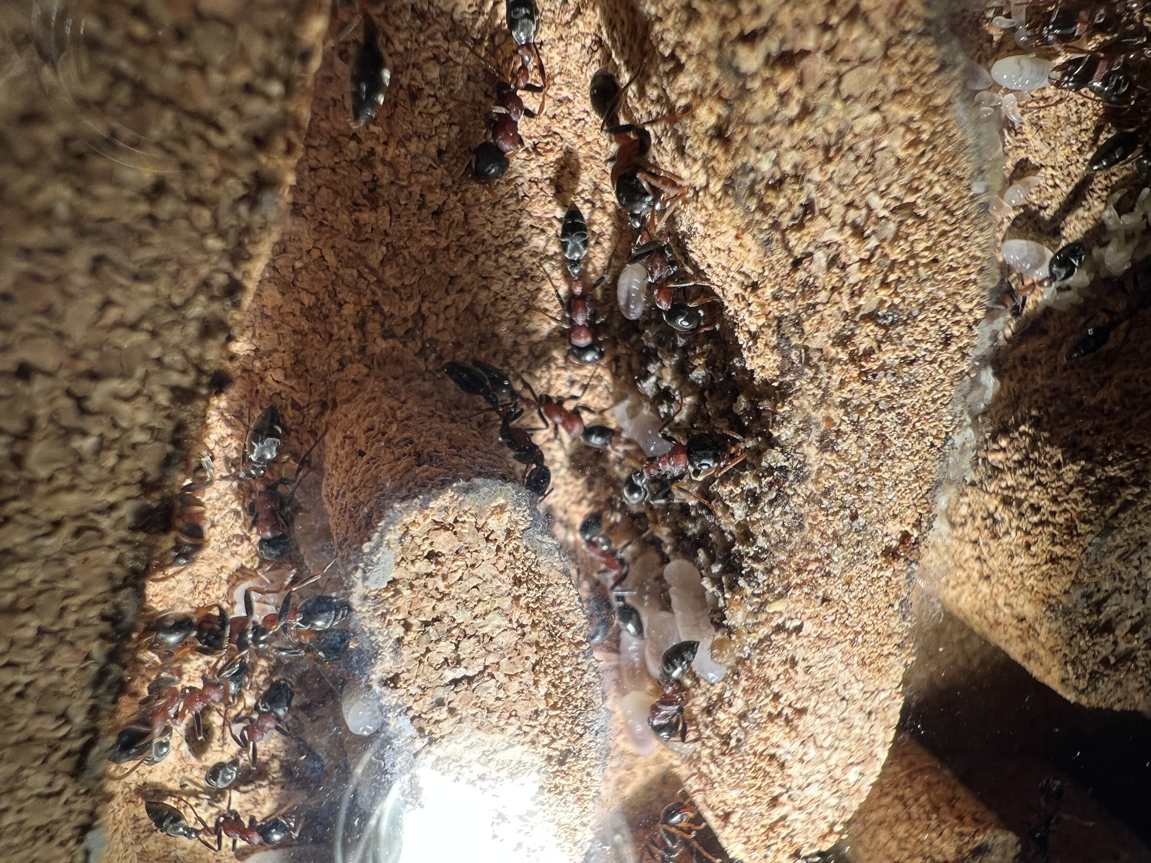 Gekauft bei Flexants, 2 Queens und 8 Workers, Haufen Eier und Puppen, unterdessen sind es immer noch 2 Queens und ca. 14 Worker, Haufen Eier und Puppen .