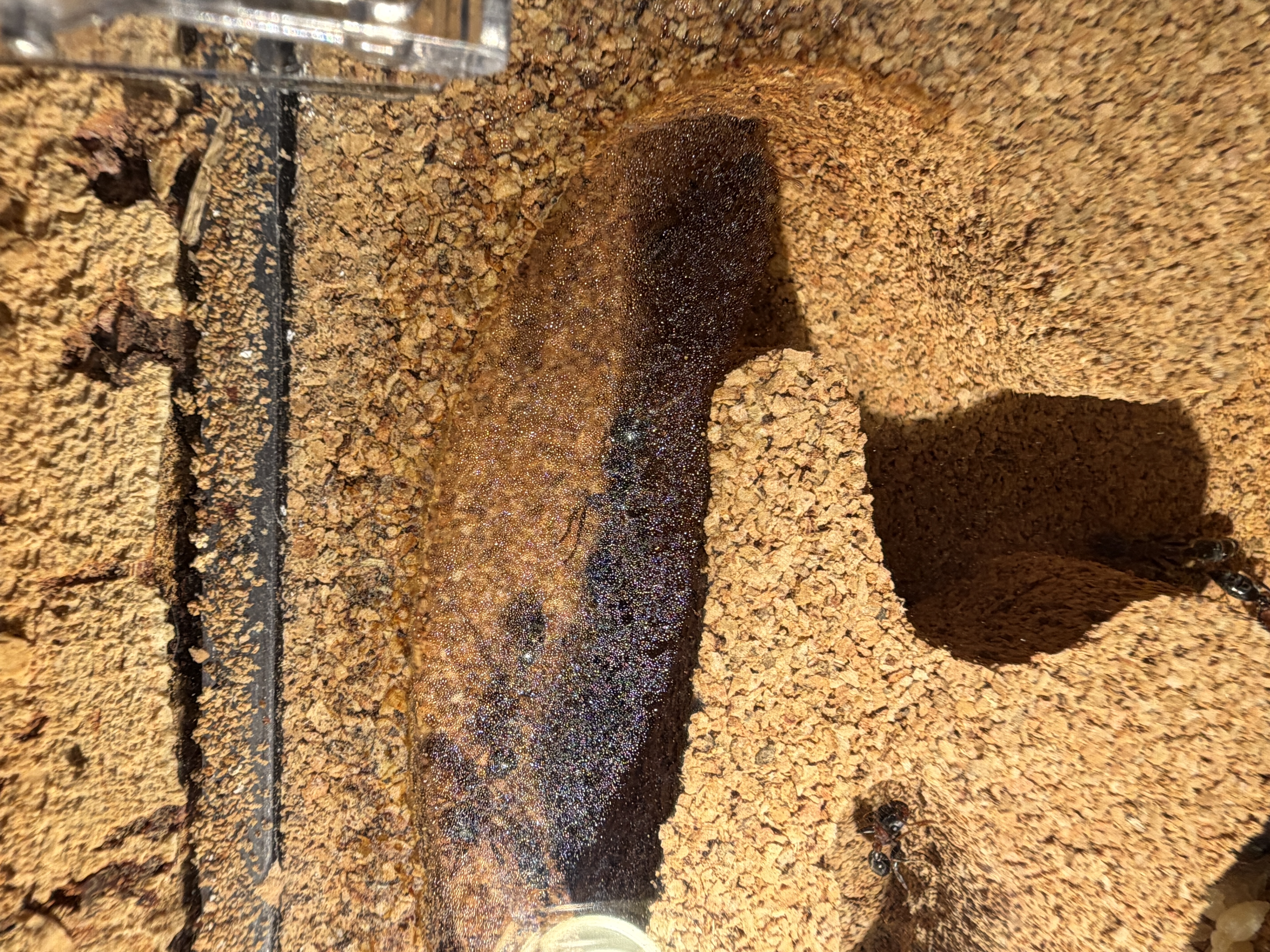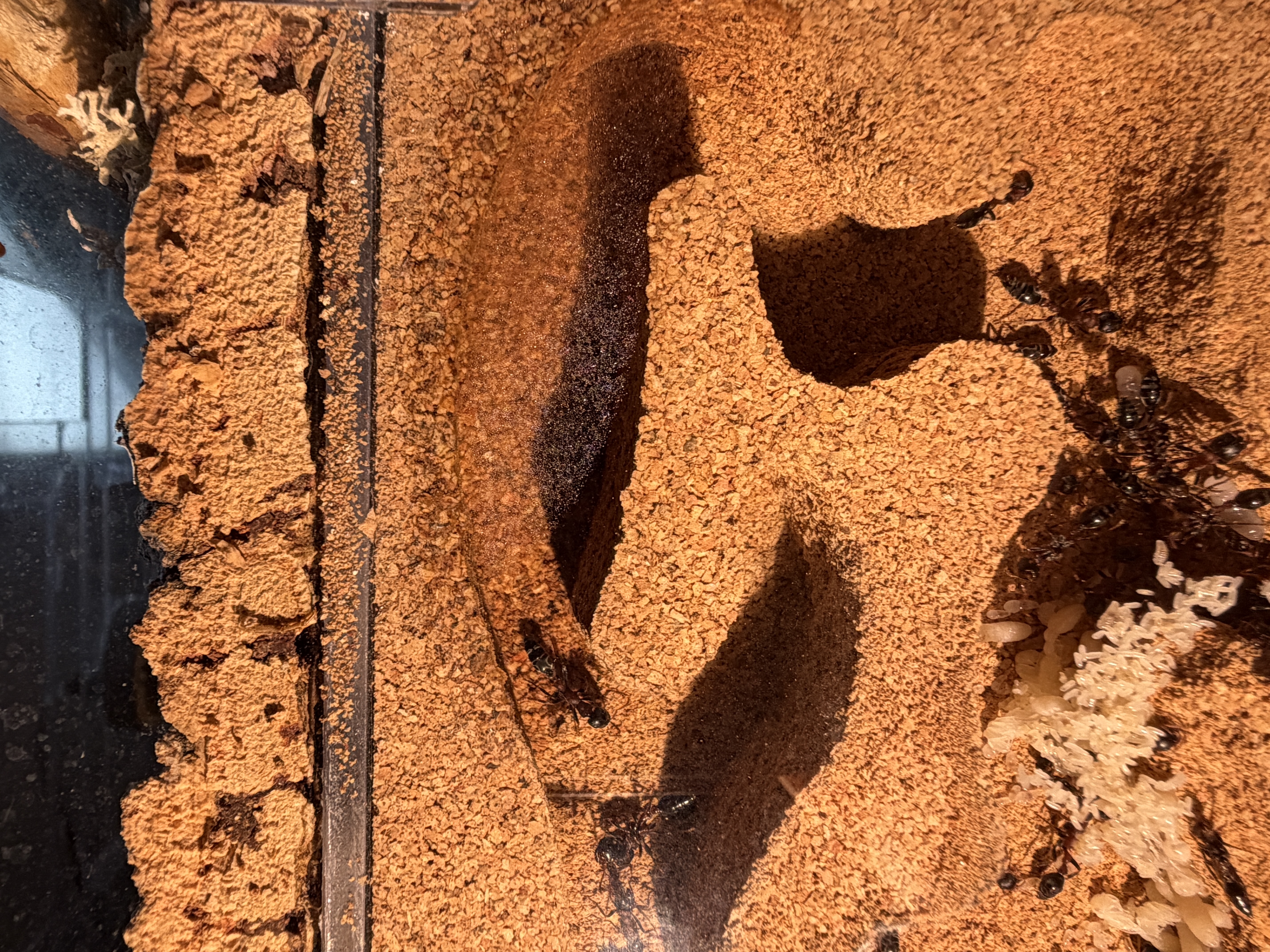Nach lÀngerer Zeit muss das Formicarium wieder einmal gereinigt werden. Es gestaltet sich mittlerweile sehr schwierig, denn die Anzahl der Arbeiterinnen in der Arena ist konstant bei 30-50 Ameisen.