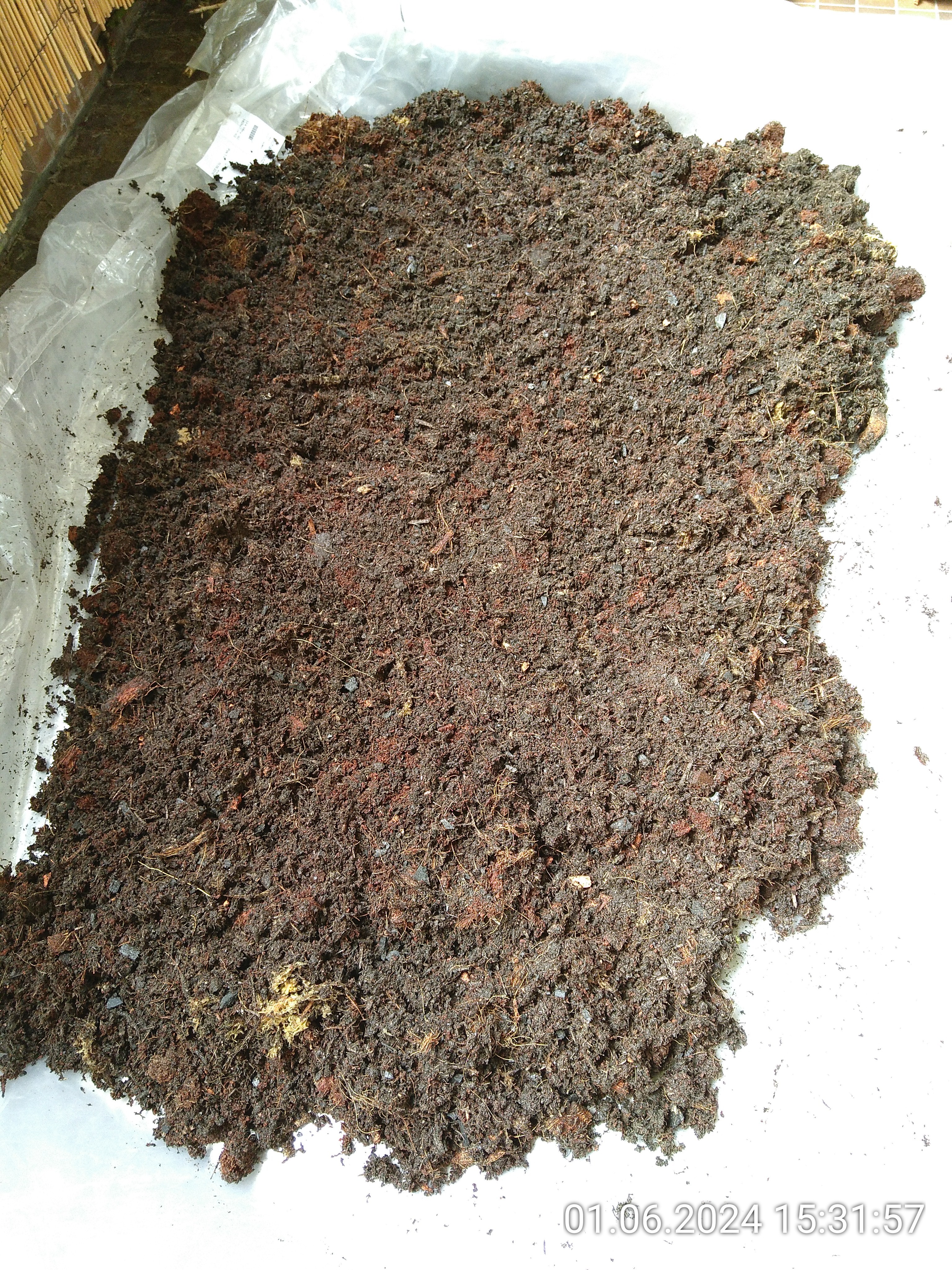 Basis ist ein Sack normaler Blumenerde. Dann kamen ein bisschen Lehm für Stabilität bei Grabarbeiten, Sphagnum Moss, Kokosfasern grob und fein für eine Auflockerung des Bodens, gemahlene Sepiaschale als Kalkquelle für die Asseln, Kohle zum Absorbieren von Schadstoffen und das oben angesprochene Sägemehl dazu. Alles kam auf eine große Plane und wurde dann schön durchgemischt. Wenn man dafür nur die Plane abwechselnd an den Seiten anhebt, macht man sich nicht mal die Hände schmutzig