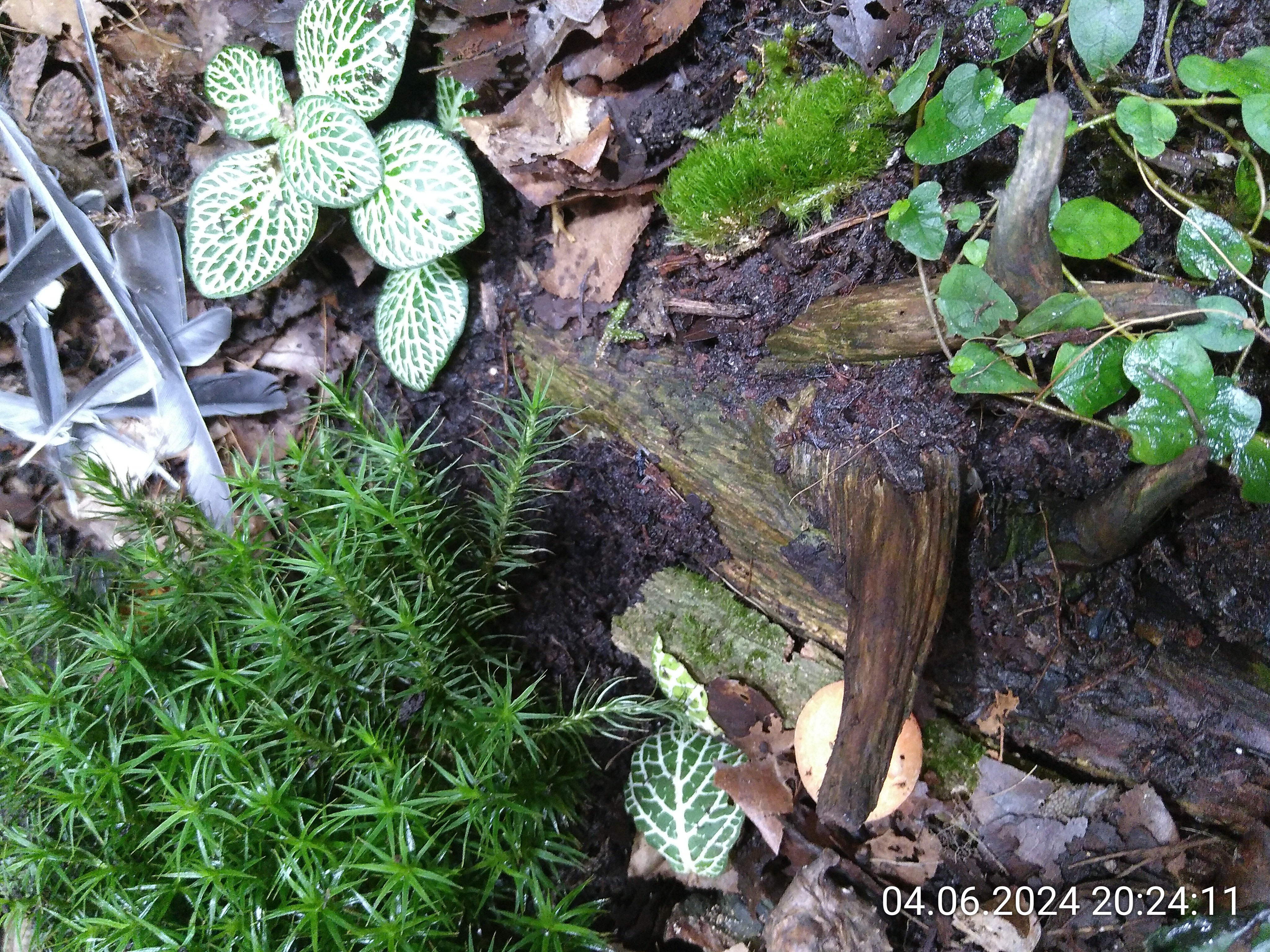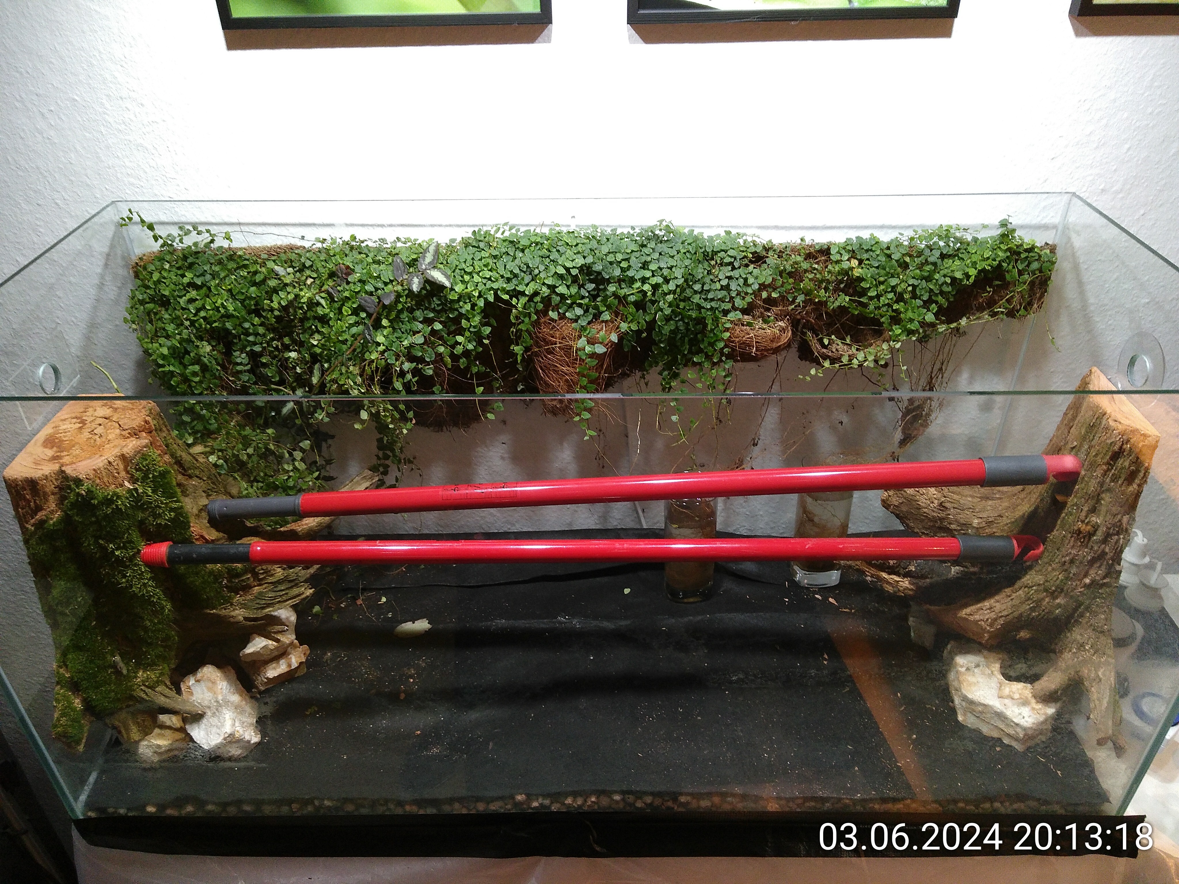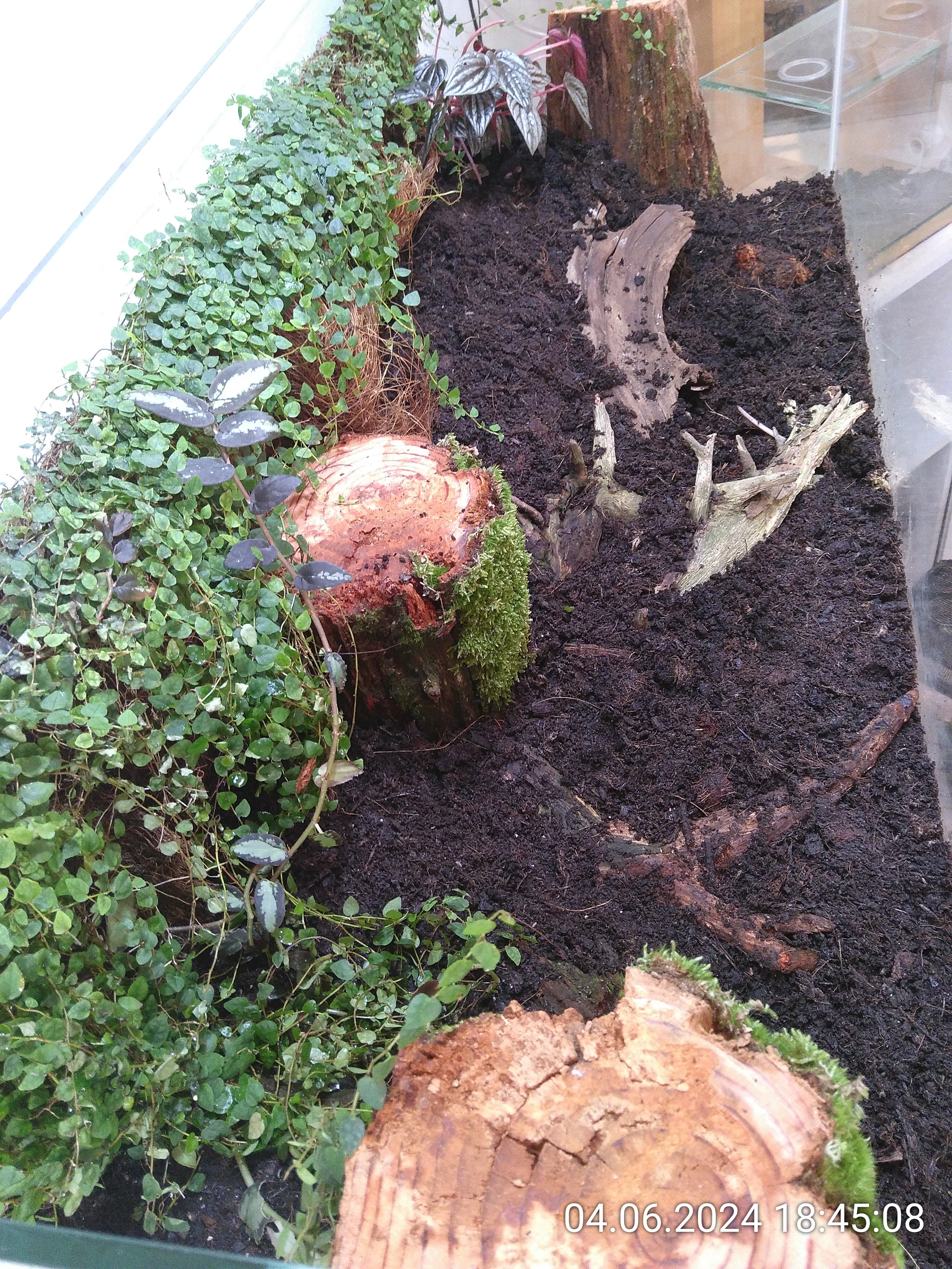 Nachdem ich die Besenstiele entfernt hatte, habe ich noch ein wenig Erde eingefüllt und dann die grobe Struktur mit ein paar Wurzelstücken vorgegeben. Auch wenn man davon später nicht viel sehen würde. Dadurch konnte ich aber leichter mehrere Ebenen im Becken schaffen und es sieht einfach natürlicher aus, auch wenn man nur ein kleines Stück davon sieht. Kleiner Tipp: Nach hinten immer ansteigend. Rechts liegt das Wurzelstück, das schon im Dschungel zum Einsatz kam. Von unten, da gibt einen Hohlraum, ist es mit Schnecken und Asseln geimpft. Es lag die letzten beiden Tage im Asselarium.