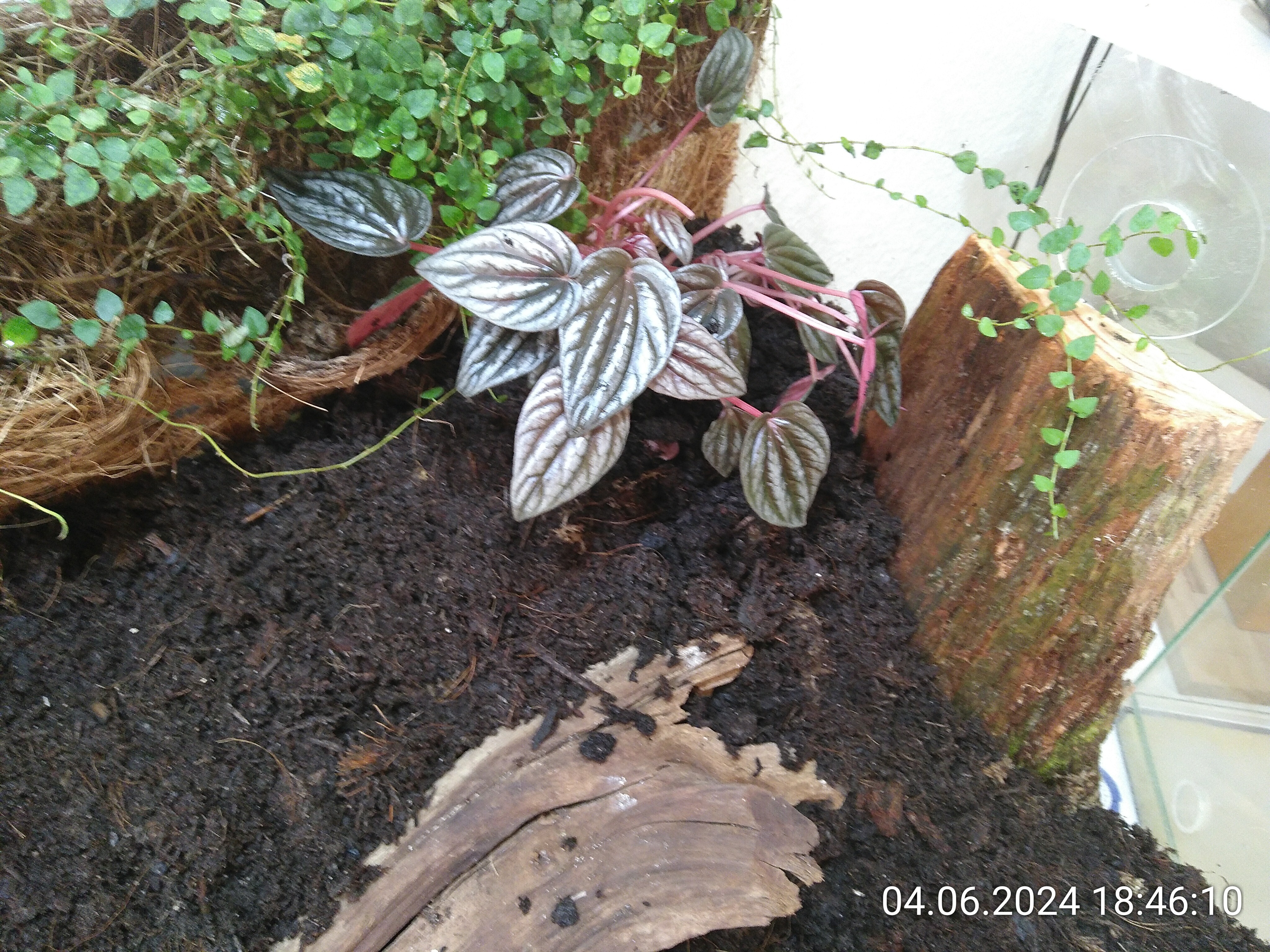 Damit hatte ich erstmal Pause. Eigentlich konnte es erst am nächsten Tag weitergehen, wenn das Silikon ausgehärtet war. Aber da waren ja noch die Wurzeln von der Ranke an der Rückwand. Die wollte ich so schnell wie möglich wieder in Erde bringen. Nach einer halben Stunde waren die Kokosmatten ausreichend fest, um an der Rückwand ein bisschen Erde aufhäufen zu können und so zumindest die Wurzeln zu bedecken.