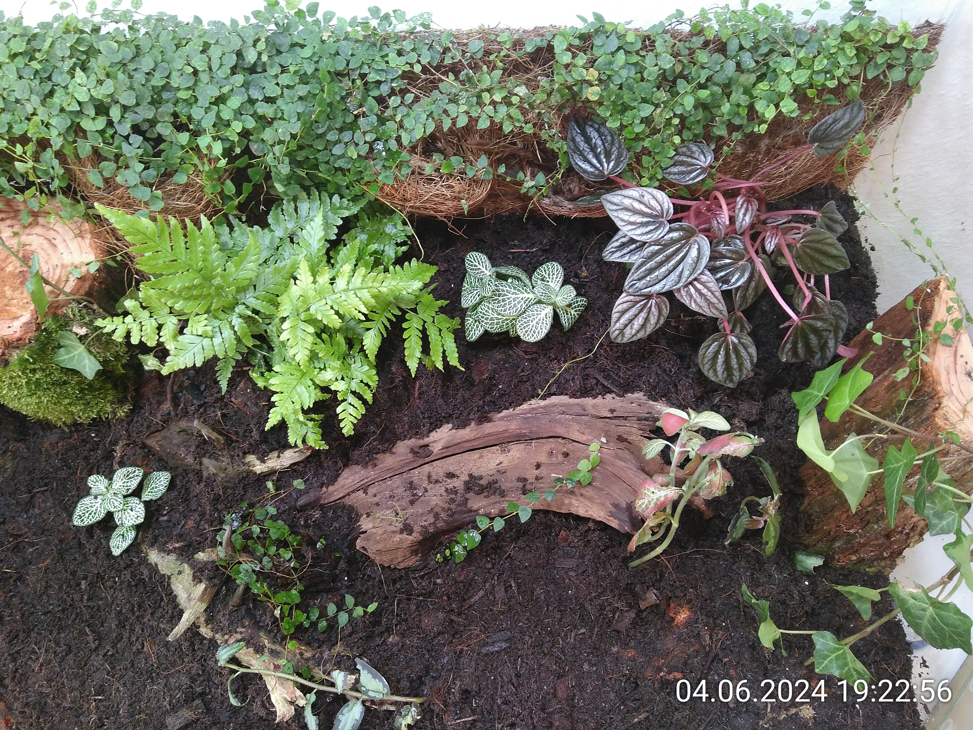 Schritt eins war einfach. Eine Drainageschicht aus Seramis und ein Vlies oben drauf, damit die Erde sich nicht dazwischen mischt. Mit den Ranken an der Rückwand starten zu können, war ein riesiger Vorteil für die anschließende Gestaltung. Meine Lebenserhaltungsbemühungen waren zum Glück größtenteils erfolgreich, wie ich wohl mittlerweile sagen kann.