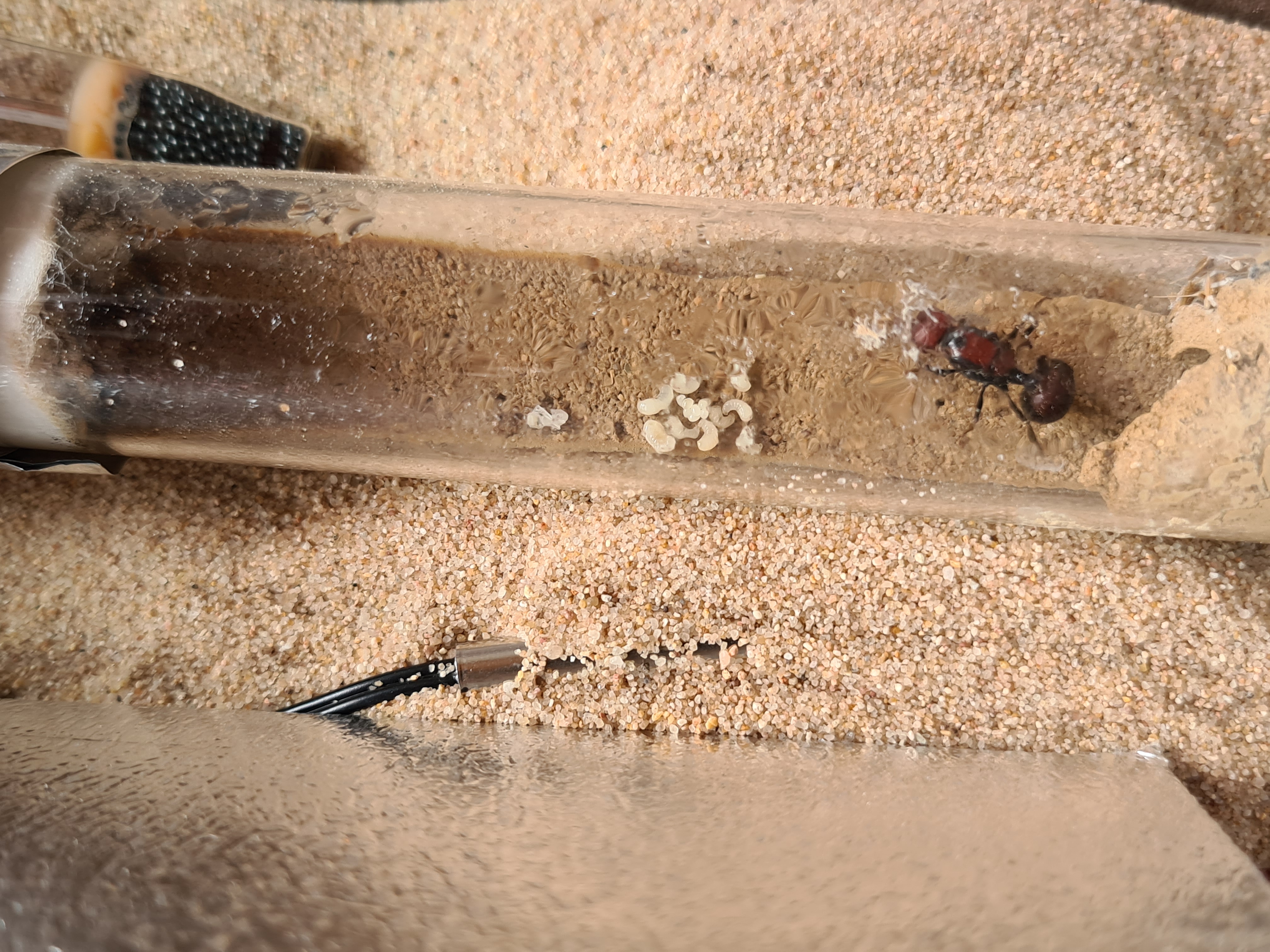 die Queen scheint sich in ihrem Reagenzglas richtig wohl zu fühlen. erstePuppen sind vorhanden, Larven und auch schon das nächste Eierpaket.