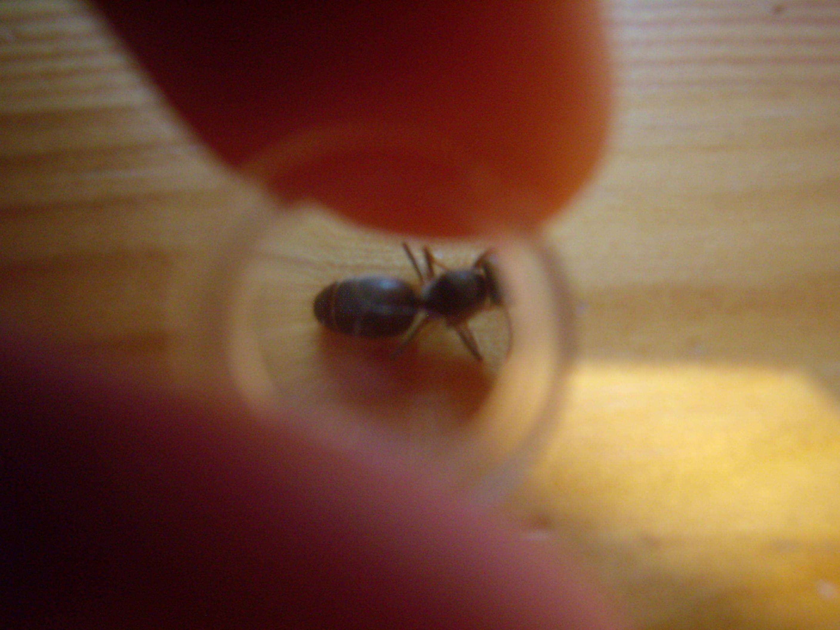 Also wenn ich mal davon ausgehe, dass diese Königin sicher nur um die 7mm groß ist (Verhältnis von deinem Finger zur Königin) - und wenn ich mir die Kopfform von Foto 3 ansehe (Fotos wirklich nicht gerade gut)..