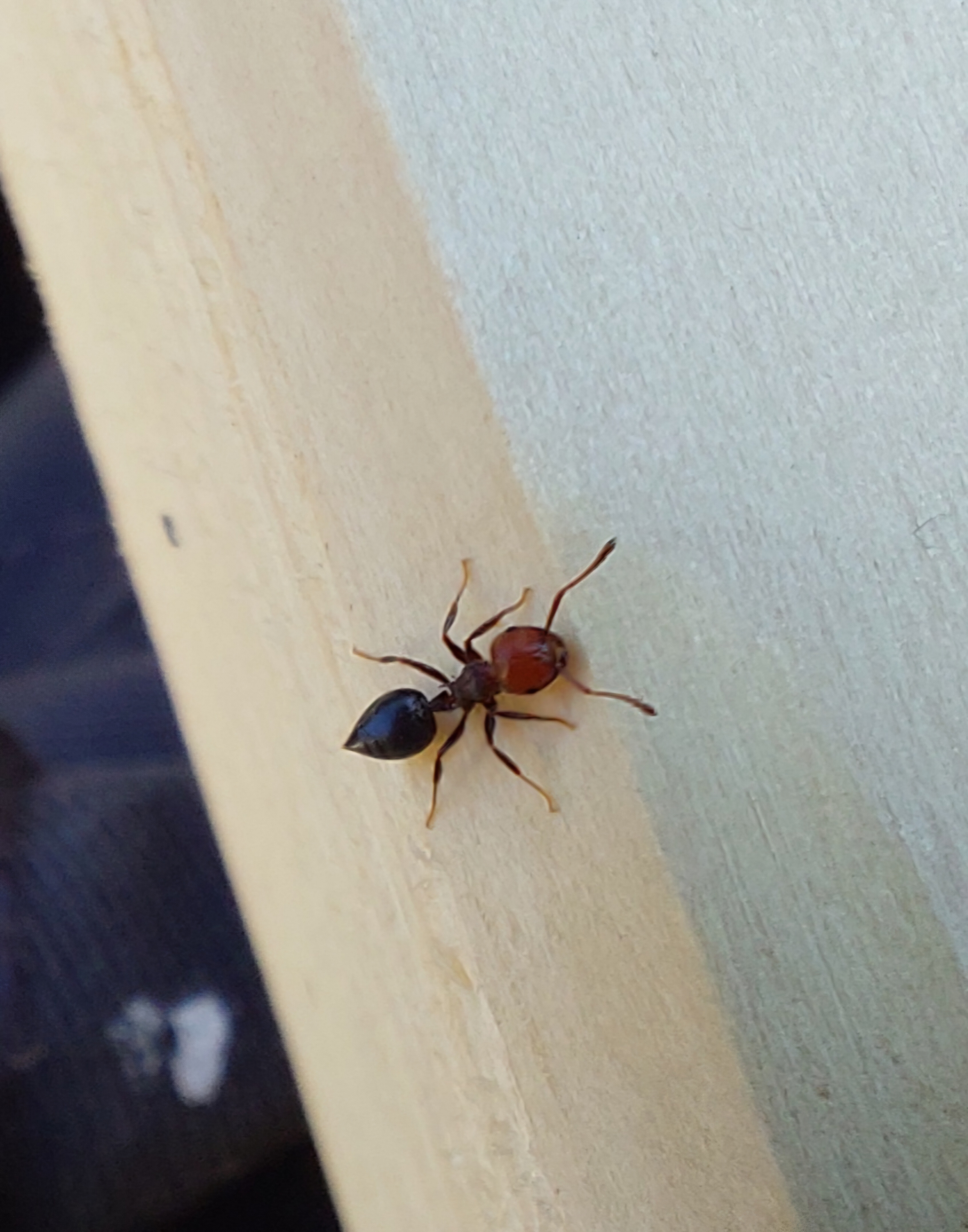 Die Ameisen sind zweifarbig (rötlichen Kopf und brauner Körper) und haben einen sehr spitz zulaufenden Hinterleib. Außerdem scheinen sie das Harz der kleinen Zypresse im Balkonkasten extrem lecker zu finden.
