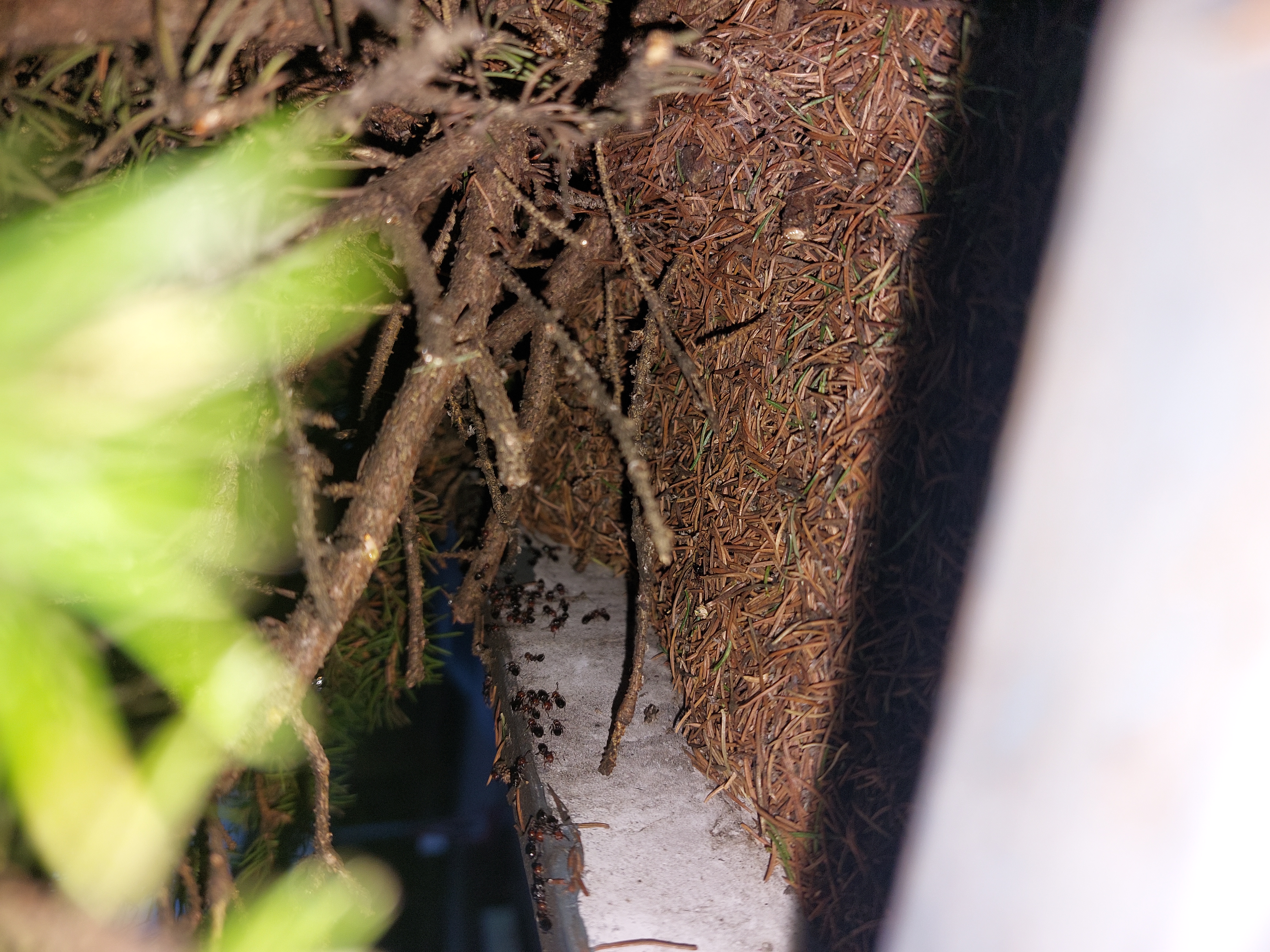 Die Ameisen scheinen sich gerne zwischen bzw. auf Holz aufzuhalten und verschwinden irgendwo in der Holzverkleidung des Dachstuhls.