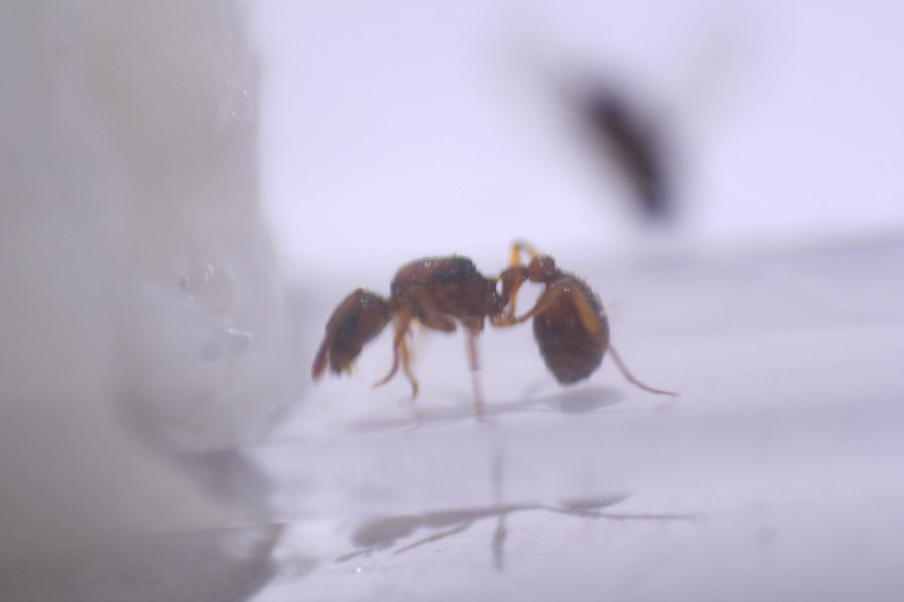 Ich tippe auf Myrmica rubra. Größe aussehen und Habitat scheinen laut dem Ameisenwiki ja zu passen.