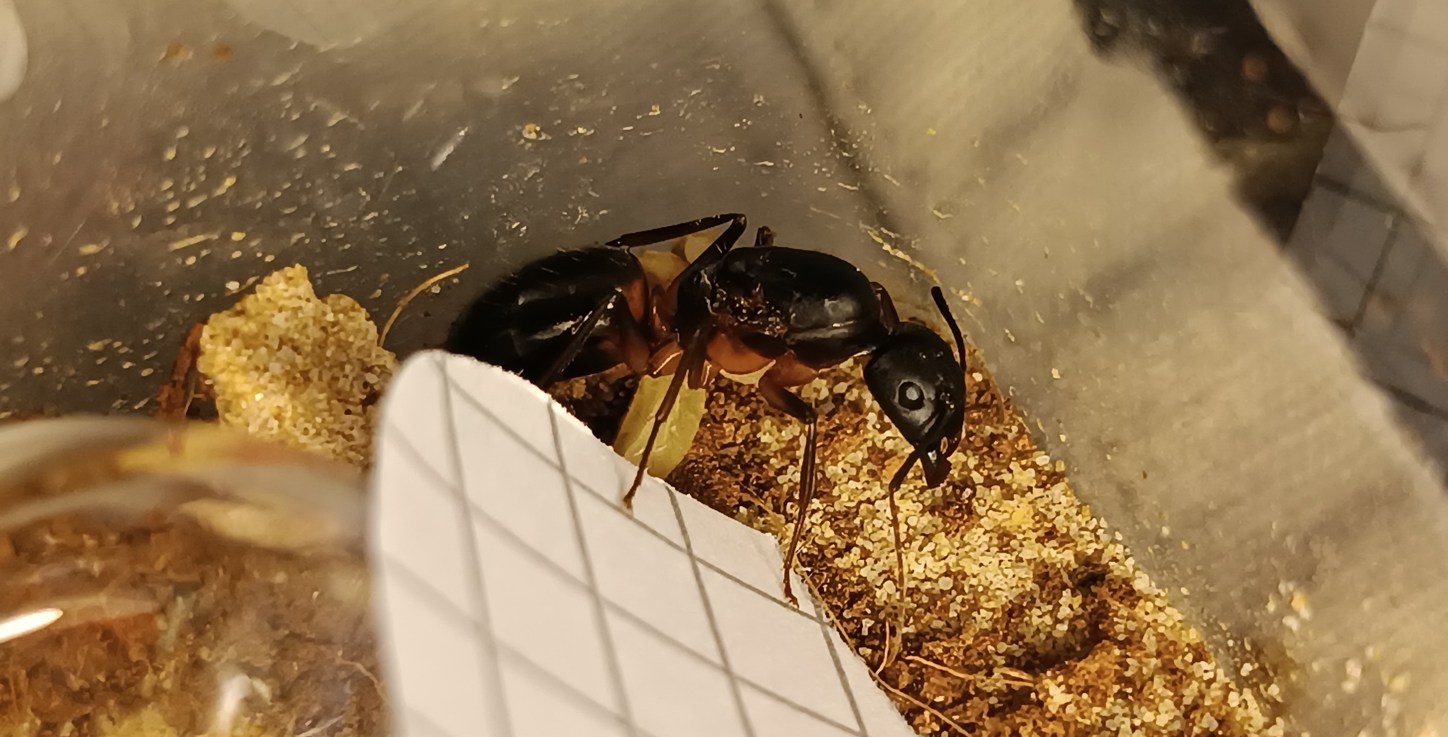 Bis jetzt habe ich ihr allerlei Futter zur Verfügung gestellt und sie bei geringer Luftfeuchte mit einer Temperatur von 27°C gehalten. Es sind noch keine Ameisen geschlüpft, sie hat jedoch