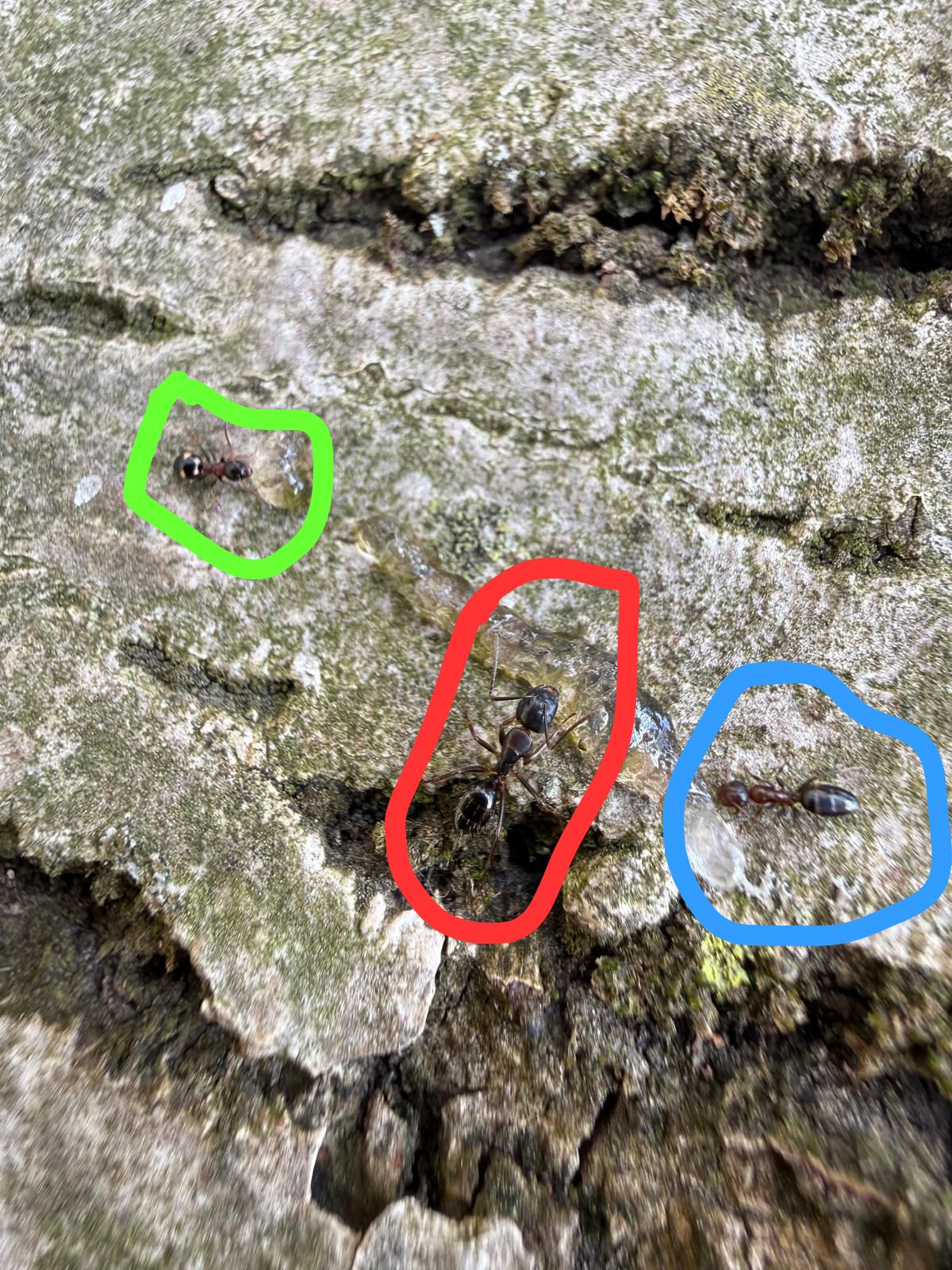 Jedoch waren auf dem Baum auch andere Ameisen, Lasius Brunneus, die Vierpunktameise und eine weitere welche ich nicht identifizieren konnte. (Siehe Fotos mit blau eingekreisten Ameisen)