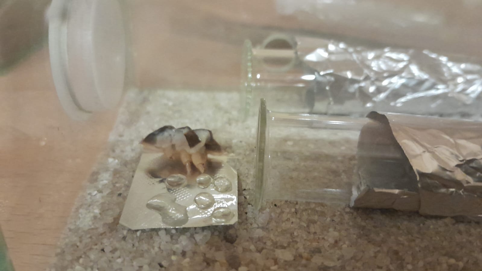 Zu Fressen biete ich aktuell Schabe und Zucker-Honig(bzw. Agavendicksaft)-Wasser an. Interessanterweise konnte ich sie heute dabei beobachten, wie sie vorsichtig aus dem Reagenzglas kam und sehr, sehr begierig das Zuckerwasser getrunken hat (ich musste jenes sogar nochmal nachliefern, da beide Tropfen in kurzer Zeit trocken gesaugt wurden!). Das hat mich darin bestärkt, dass meine Entscheidung, ihr Futter+Arena anzubieten, definitiv die richtige war. Auch sahen die