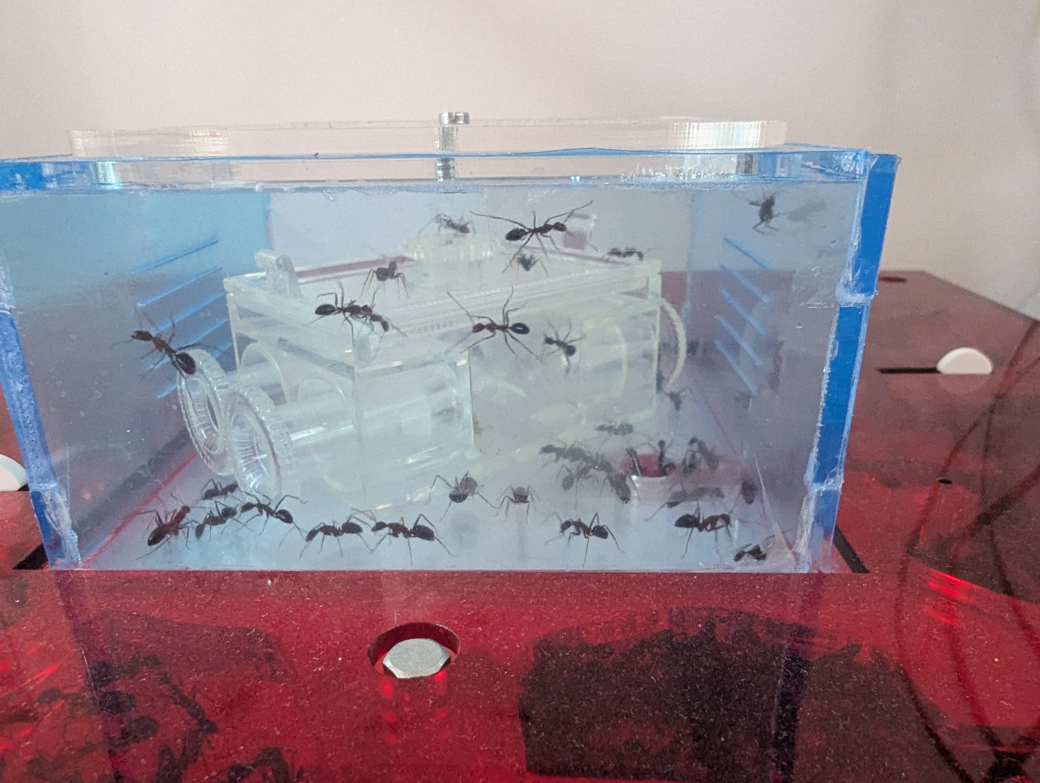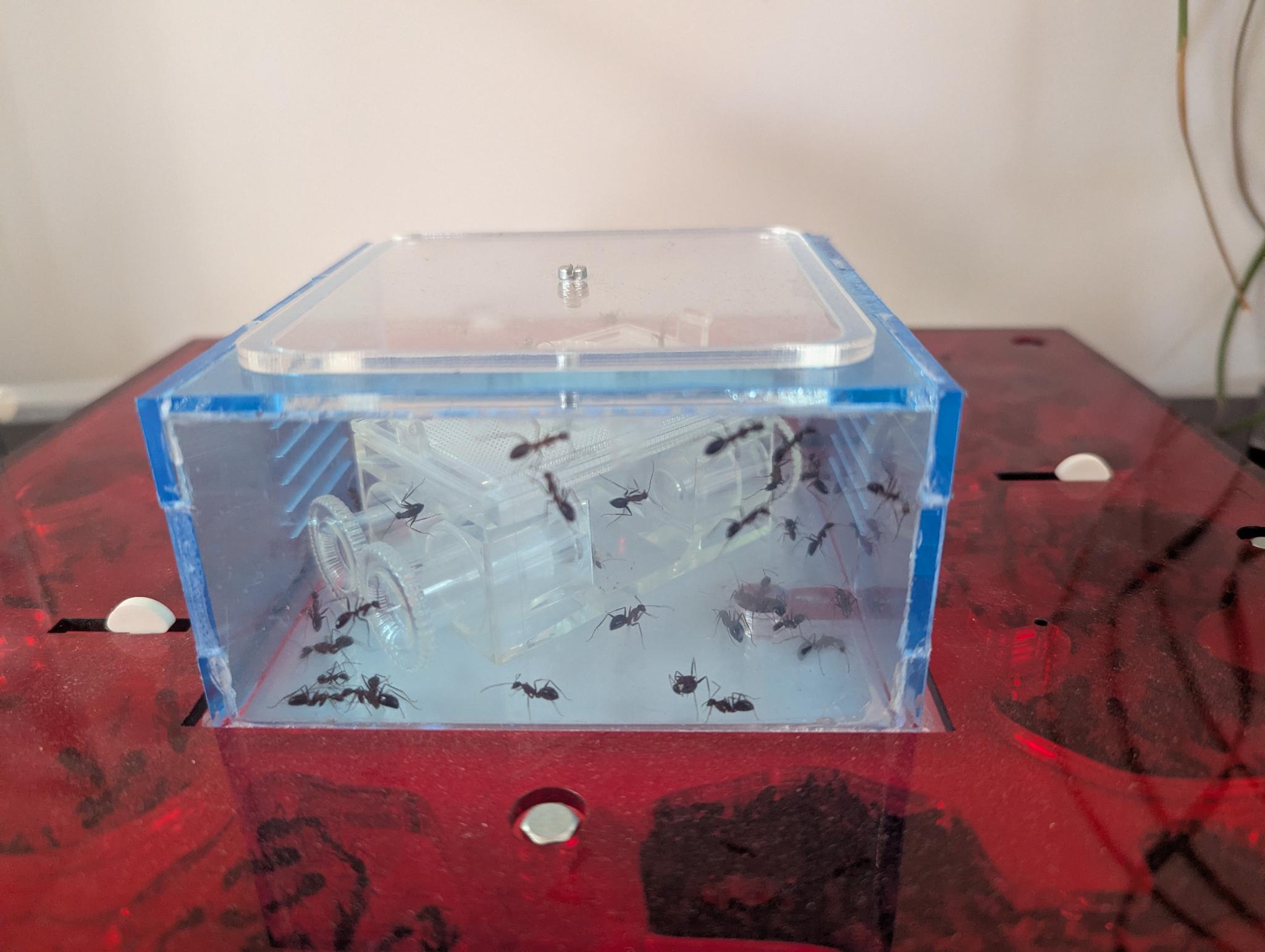 ich habe nun die Königin im AC Nest in die kleine Aussenwelt am Hauptnest gelegt. Wie befĂŒrchtet, sind die Arbeiterinnen des Hauptnestes recht aufgeregt rumgerannt und haben angefangen das Nest anzugreifen. Da es mir zu viele Ameisen wurden, habe ich den Zugang zur rechten Seite wieder verschlossen. Nach einer Weile sind nun alle etwas ruhiger. Spannenderweise war die Königin noch recht ruhig.