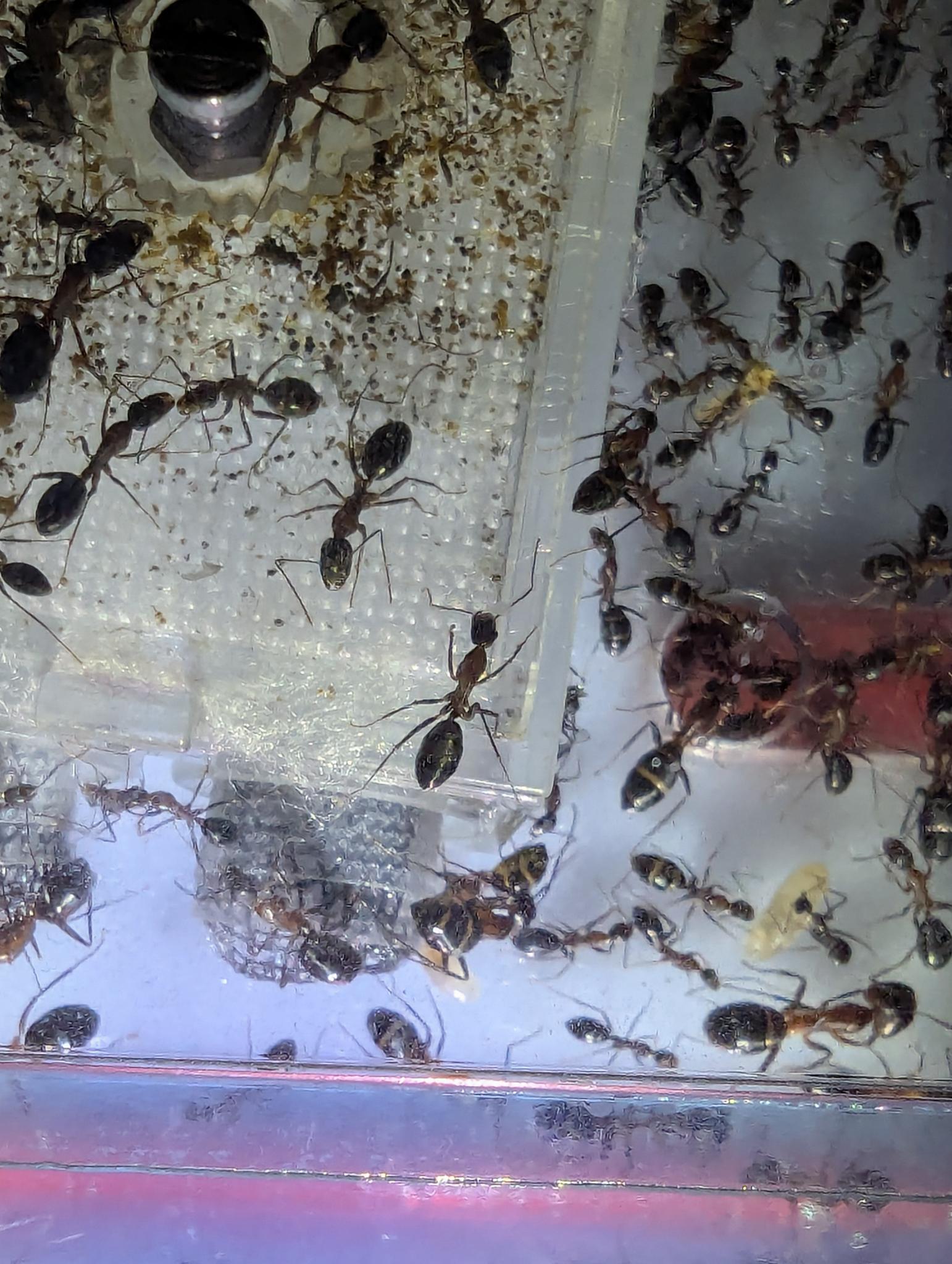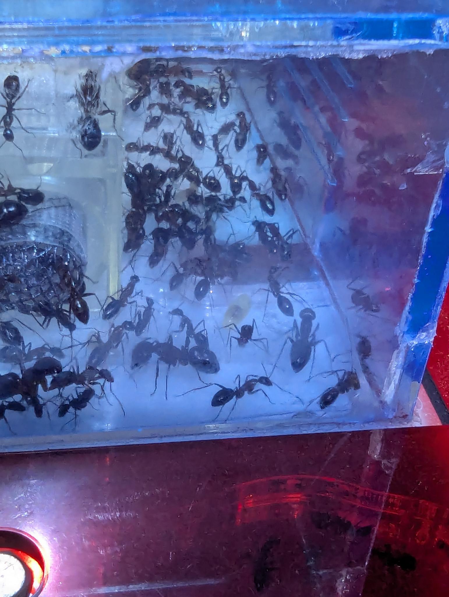 Kurzes update. Ich habe das kleine Nest noch mal angepasst und zwei der Eingänge mit einem Stoff/Plastikgitter verschlossen, damit sich der Geruch besser verteilen kann. Ausserdem habe ich auf der anderen Seite einfach direkt Watte reingestopft und die eine mit Wasser und die andere mit Zuckerwasser getränkt. Ebenfalls habe ich der Königin Drosophila angeboten, welche sie tatsächlich direkt gemampft hat.