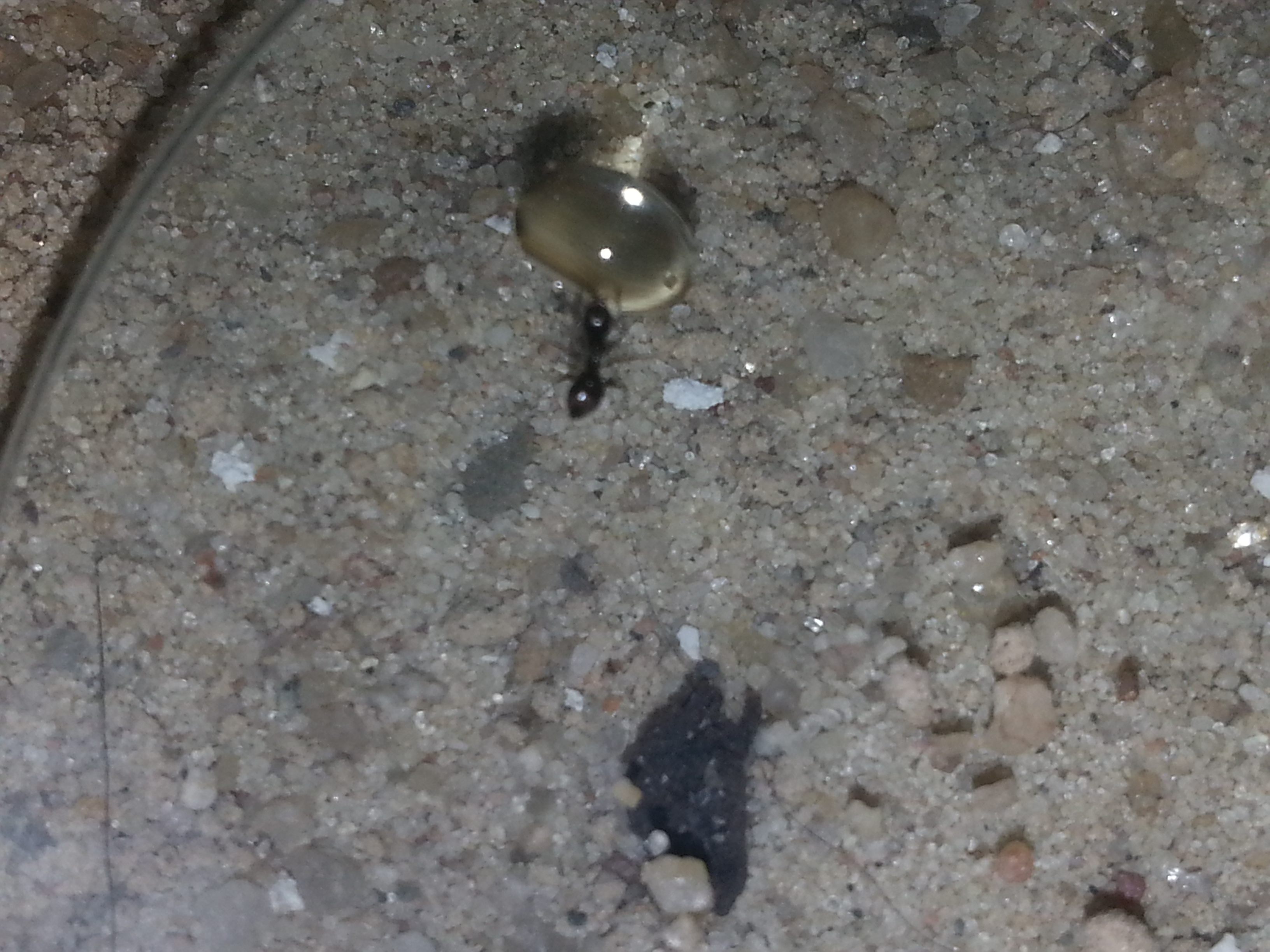17 Arbeiterinnen waren gleichzeitig (:respekt:) auf dem Urglas :bananadancer: Ich hatte einen großen Tropfen und einen Haufen MĂŒckenlarven darauf getan, was aber erstmal aufgrund eines undefinierbaren schwarzen Flecks (???) den Ameisen unwichtig schien.