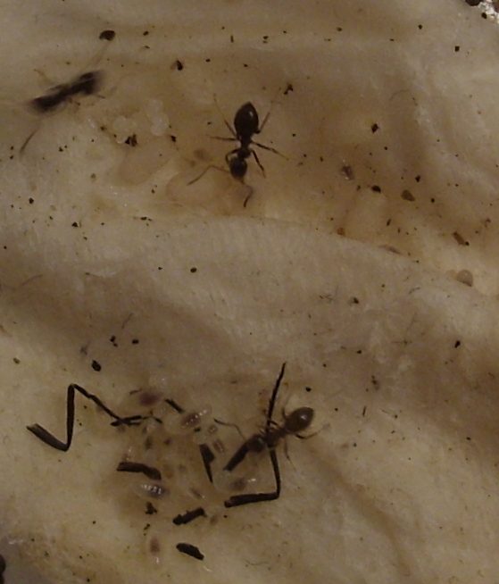 Bei dem wirrwarr konnte ich heute 6 Arbeiterinnen entdecken. Das waren schon mal mehr (8-10 also nich viel mehr ^^ ), es ist aber nicht auszuschließen, dass sie in den Ritzen des Taschentuchs saßen. Auf jeden Fall bedeutet dass, dass die Kolonie nicht wirklich wächst.