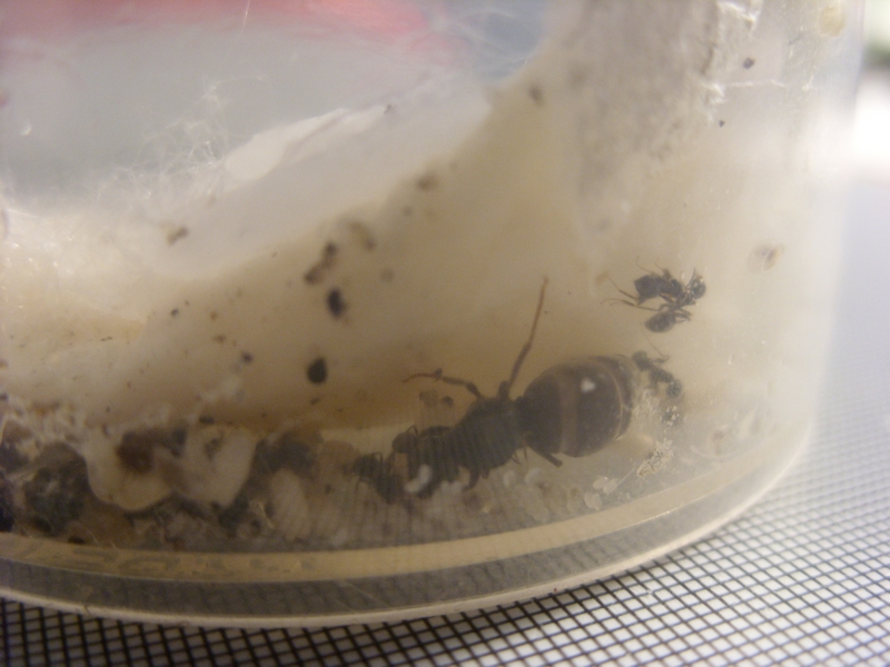 Über die kleine Kolonie:Bei den Mädels habe ich heute eine leicht angeschimmelte Fliege herausgeholt. Dies war aber der einzige Schimmel den ich entdecken könnte. Da ich heute Watte gekauft habe, habe ich auf das Taschentuch etwas feuchte Watte gepackt. Ich hoffe dort hält sich die Feuchtigkeit besser als im Taschentuch, welches teilweise nach 2 Tagen schon wieder total trocken war.