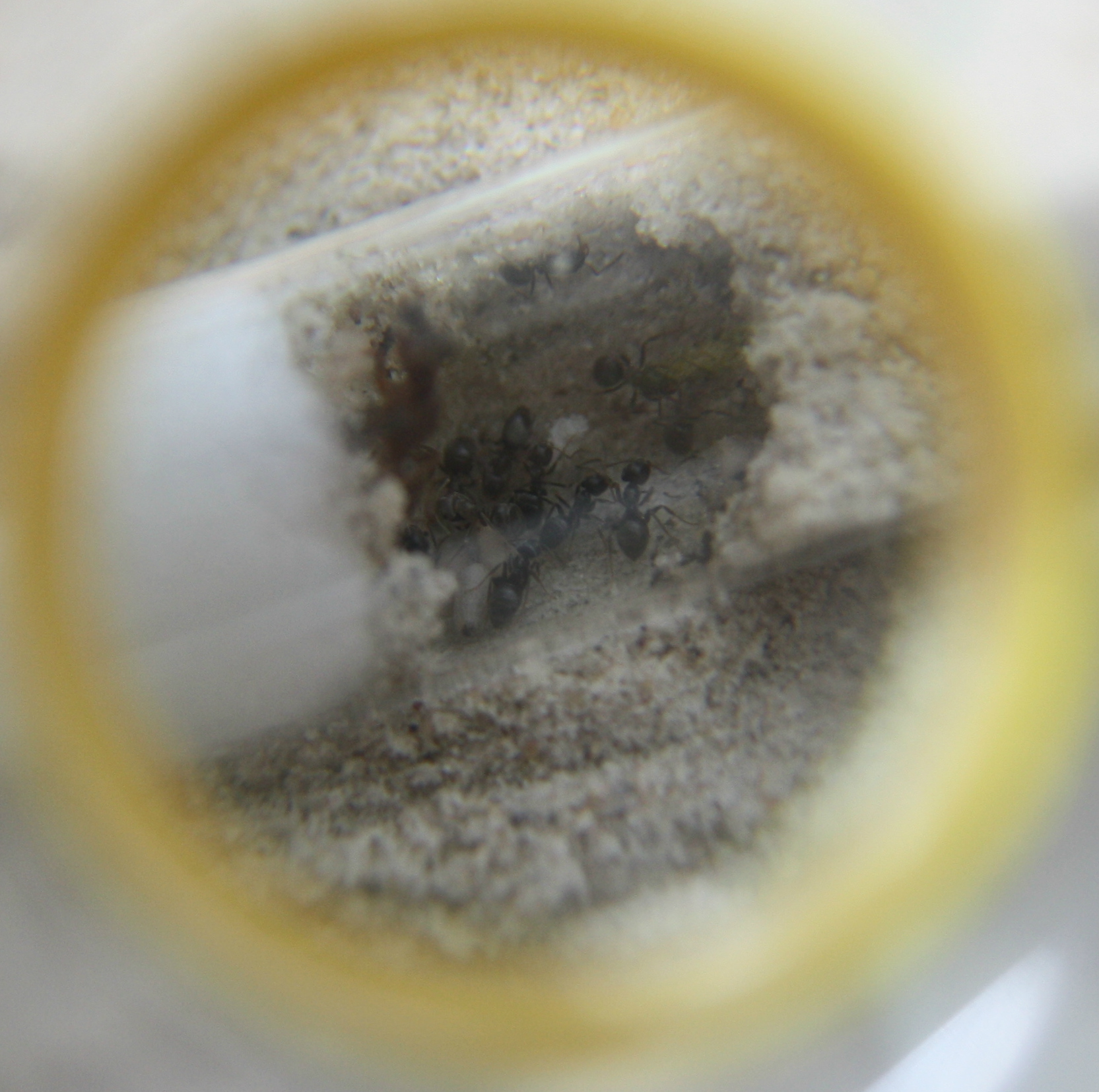 Zuhause angekommen wurde sie dann durch Bildvergleiche und mit einiger Skepsis von mir, auf Lasius cf. flavus bestimmt. Dazu muss man sagen, dass ich noch ein wirklicher Anfänger in der Ameisenhaltung bin und mir eigentlich erst nächstes Jahr eine Kolonie von Lasius niger zulegen wollte.